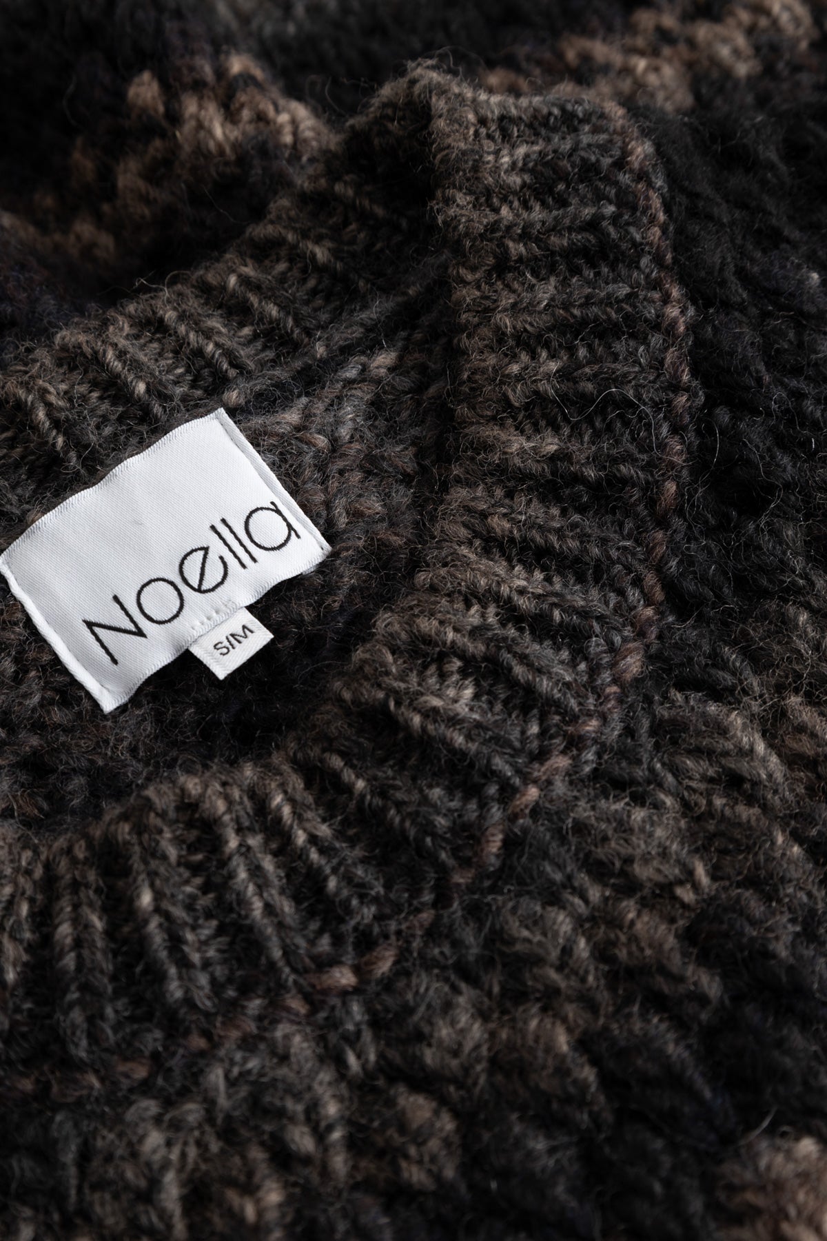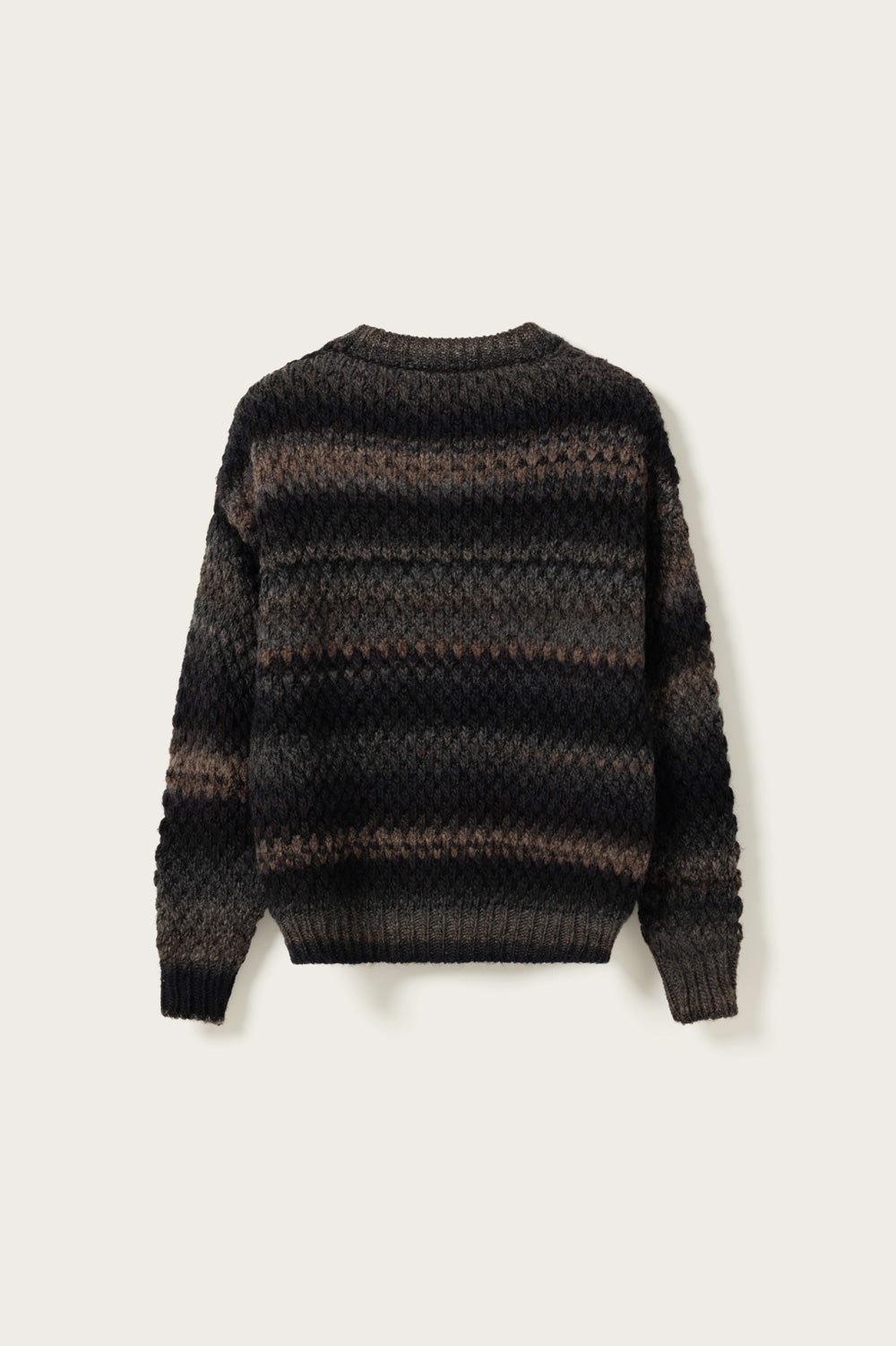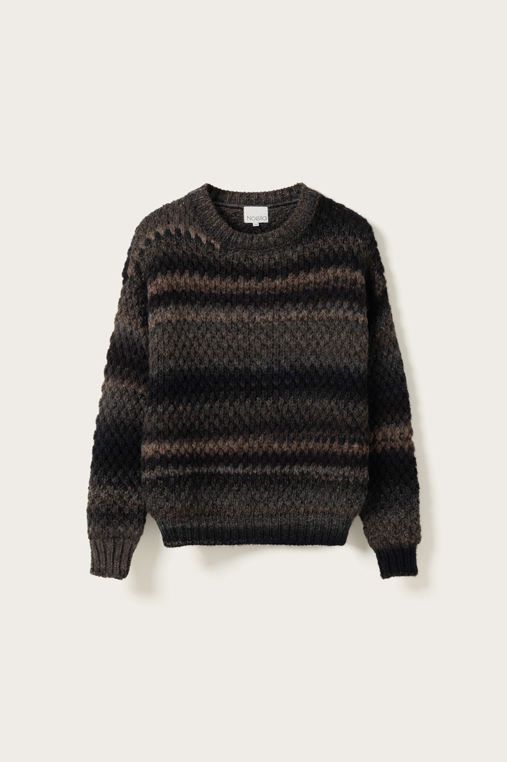 Gio Knit Sweater er en løs genser laget i 53 ull. Hvert produkt er unikt på grunn av innfargingsprosessen av garnet, som kan skape variasjoner fra produksjon til produksjon.
