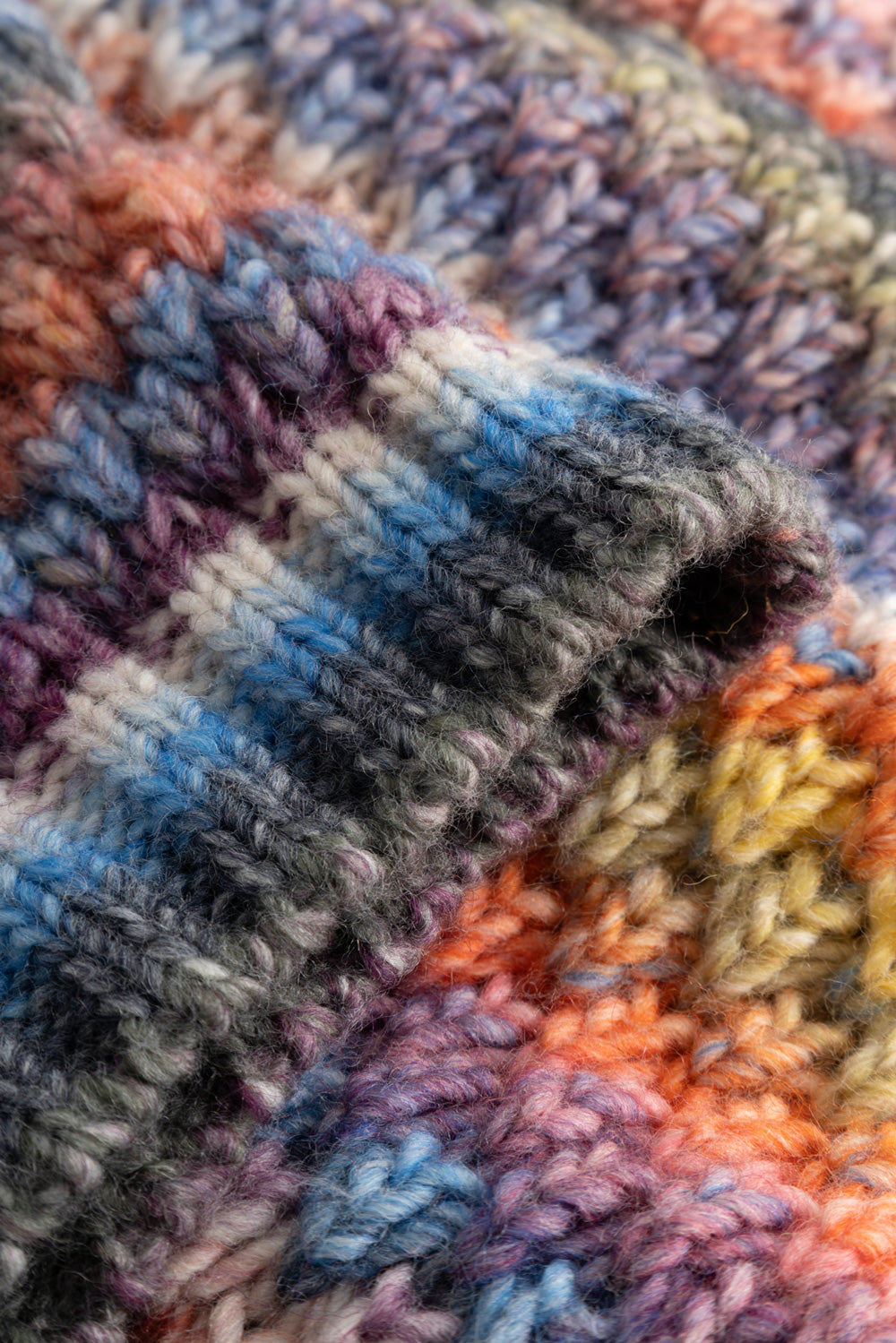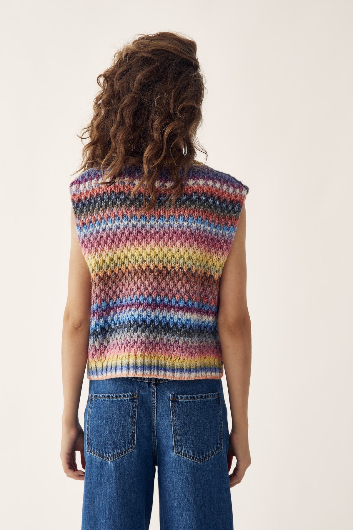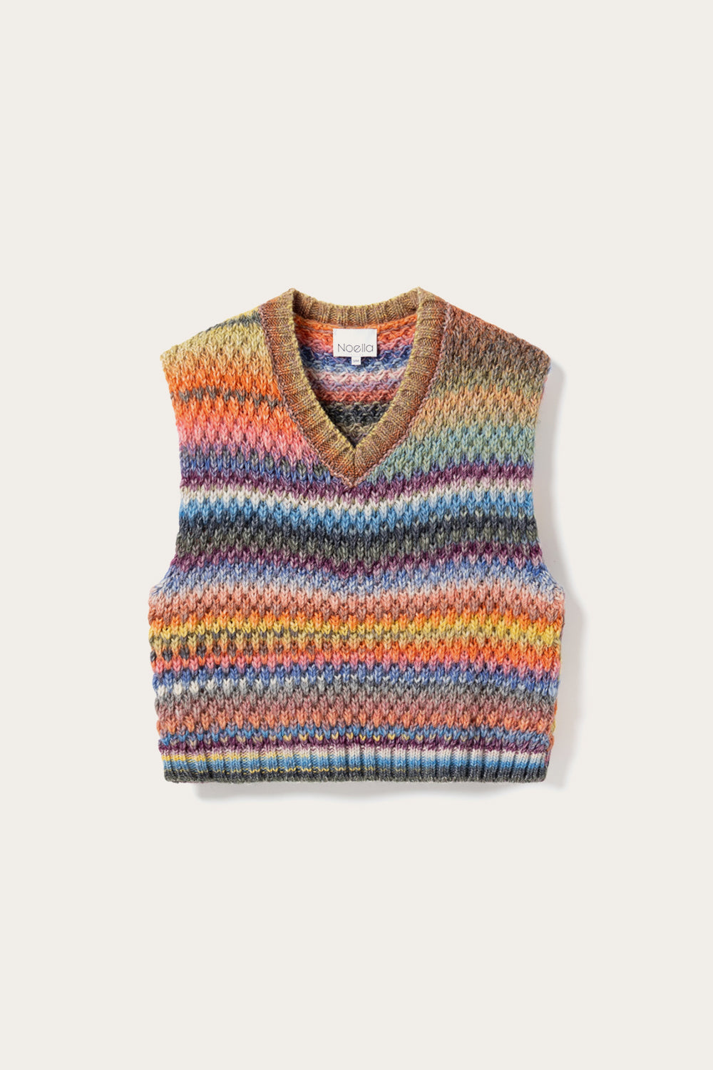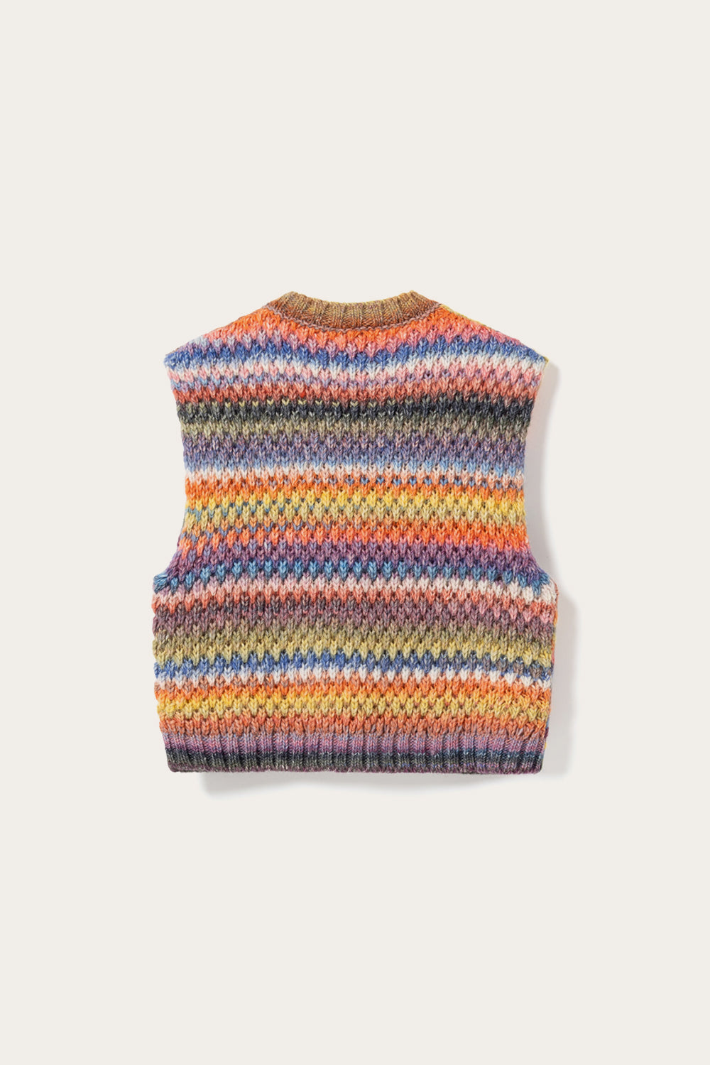 Gio Knit Vest er en kraftig vest laget i 53 ull. Den har en løs passform og er perfekt til lag-på-lag-styling. Hvert produkt er unikt på grunn av innfargingsprosessen av garnet, som kan skape variasjoner fra produksjon til produksjon.