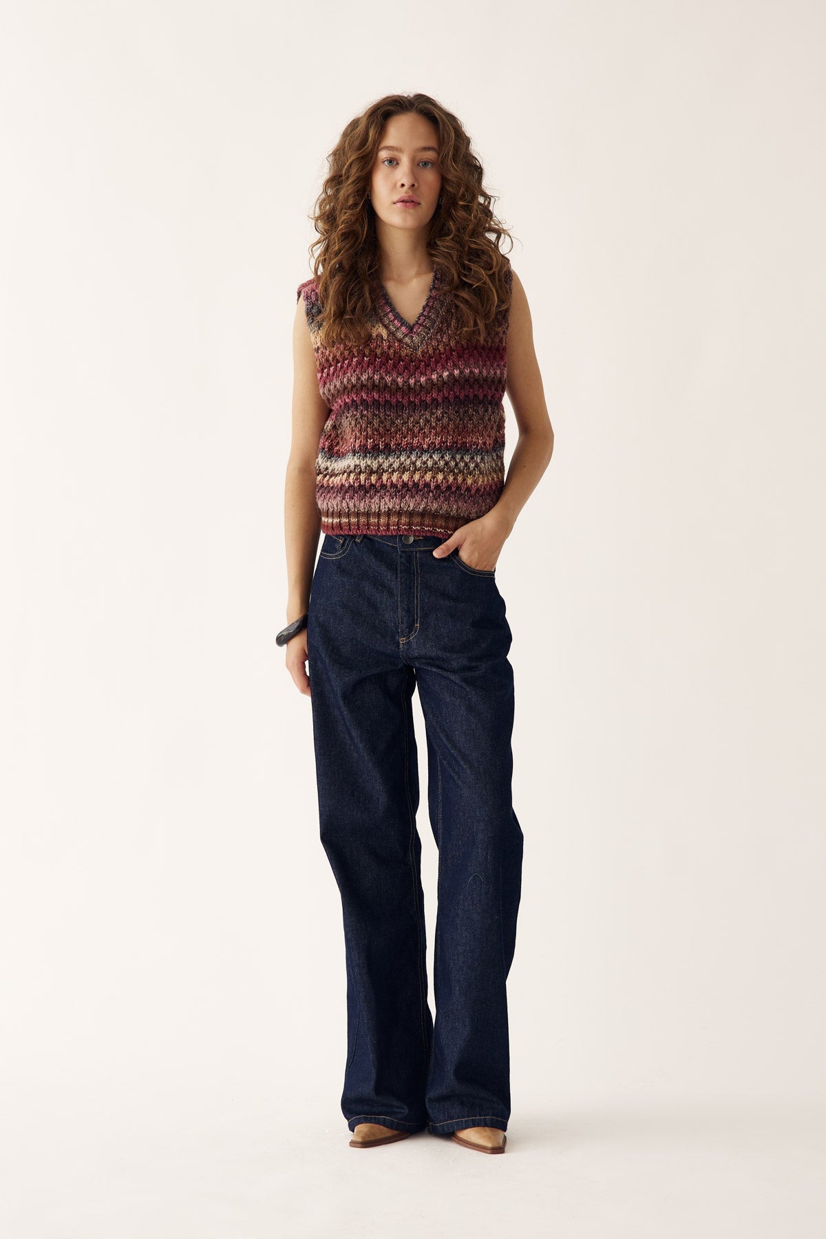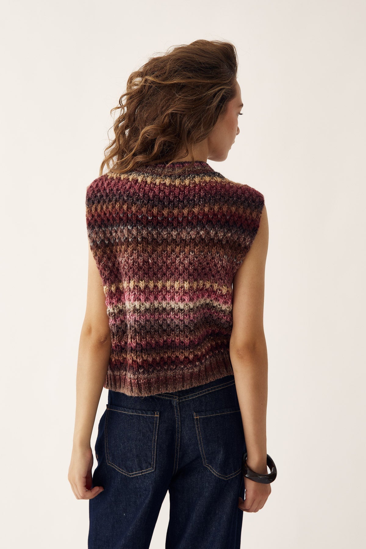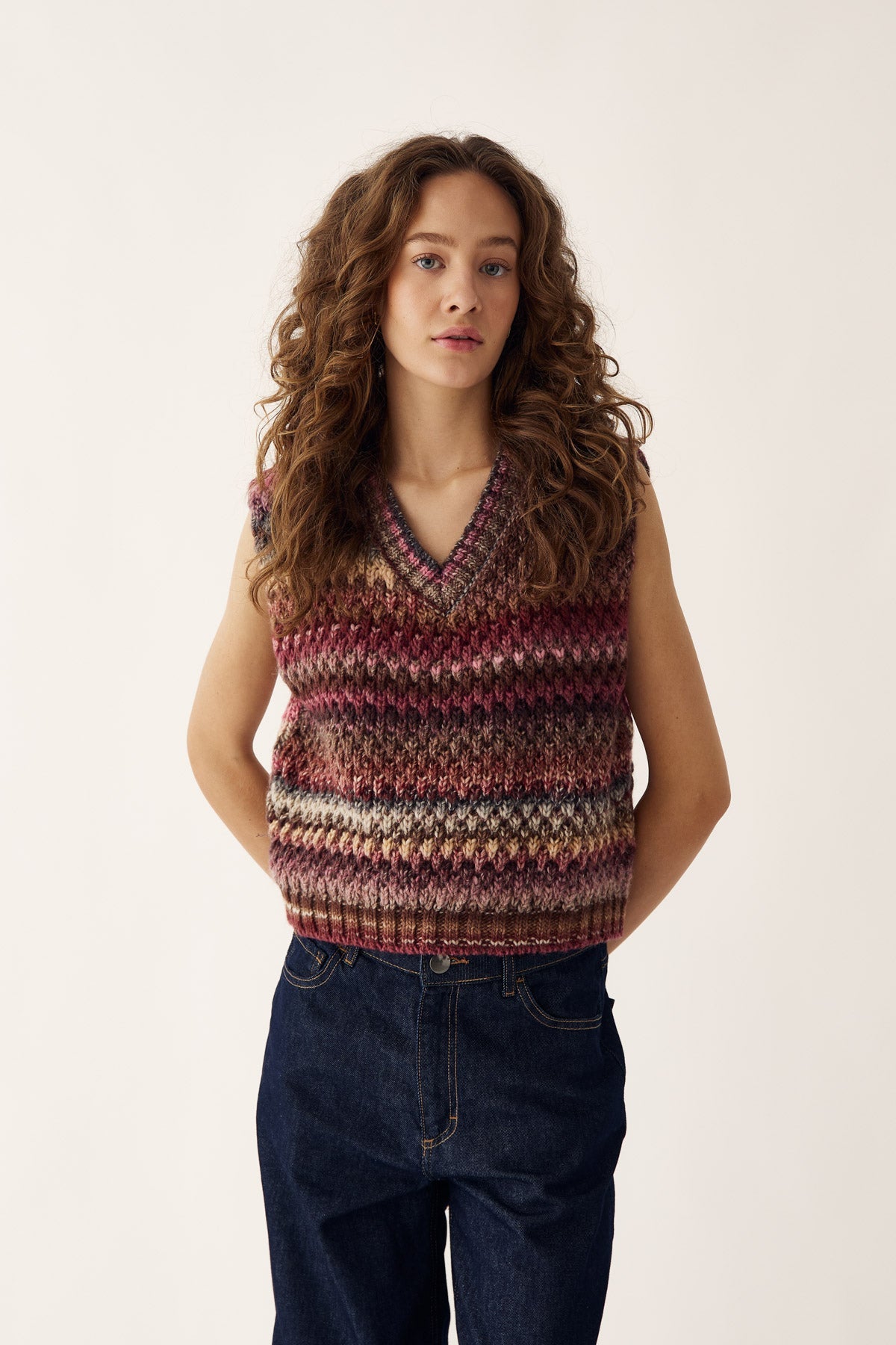 Gio Knit Vest er en kraftig vest laget i 53 ull. Den har en løs passform og er perfekt til lag-på-lag-styling. Hvert produkt er unikt på grunn av innfargingsprosessen av garnet, som kan skape variasjoner fra produksjon til produksjon.