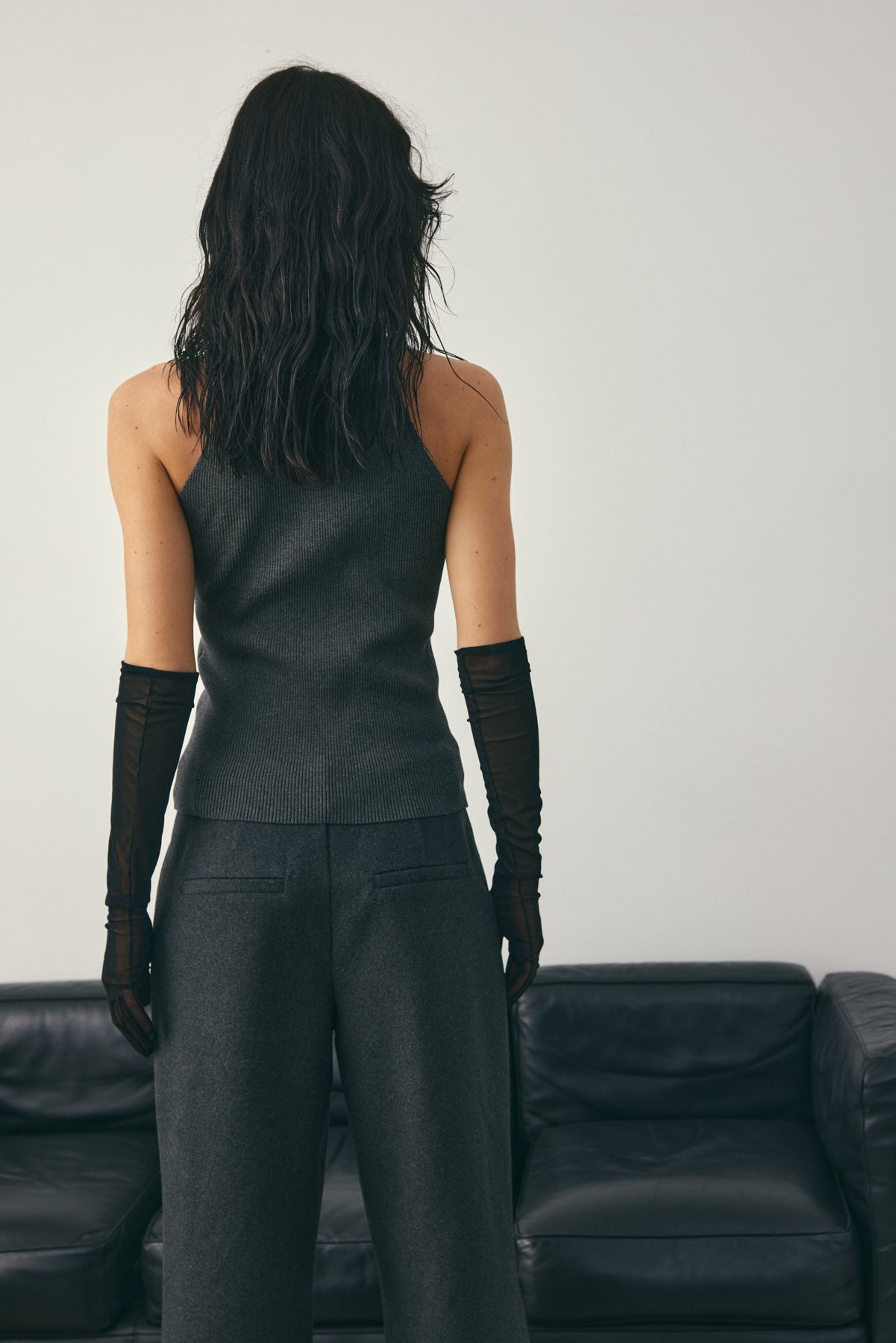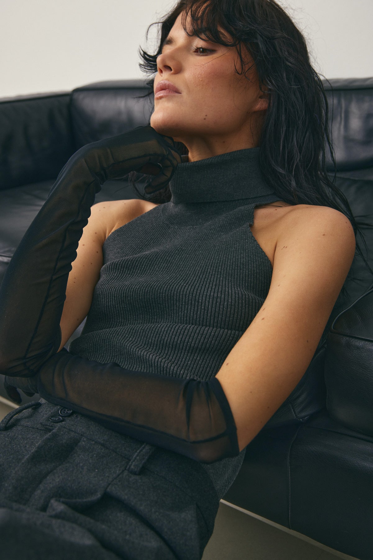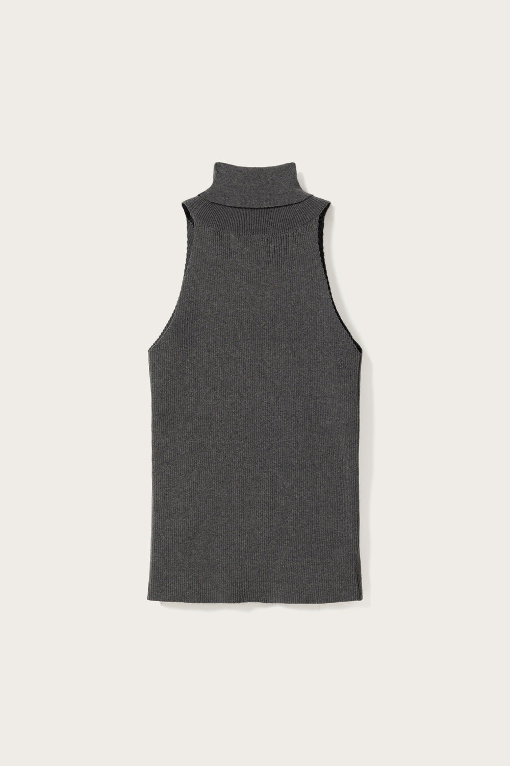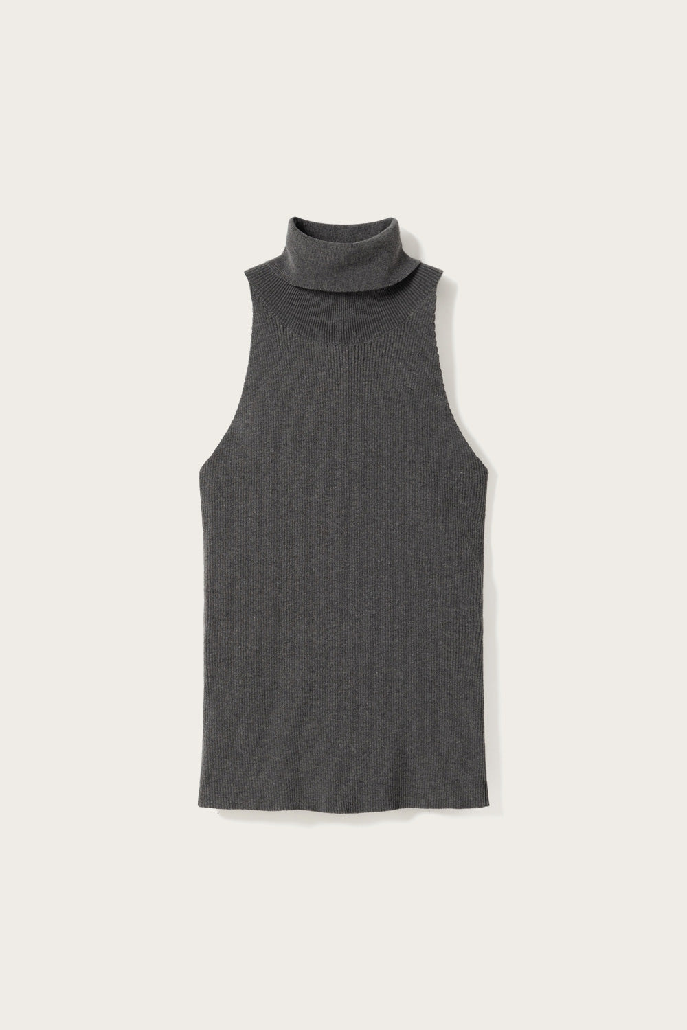 Lajoia Knit Top er en ermeløs ribbestrikket topp med høy rullekrage og en tettsittende passform.