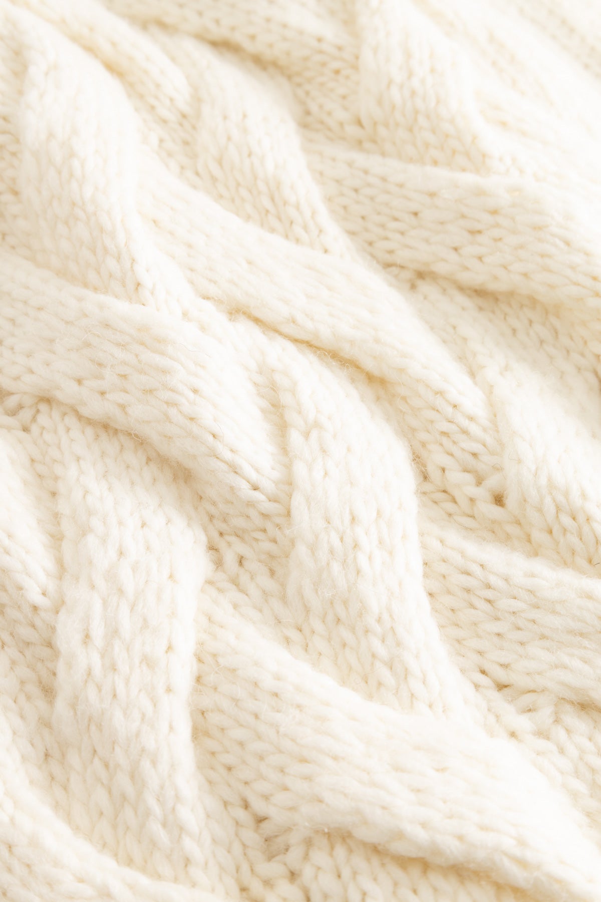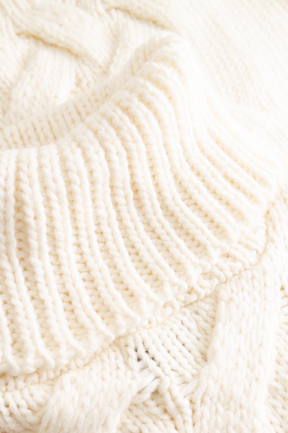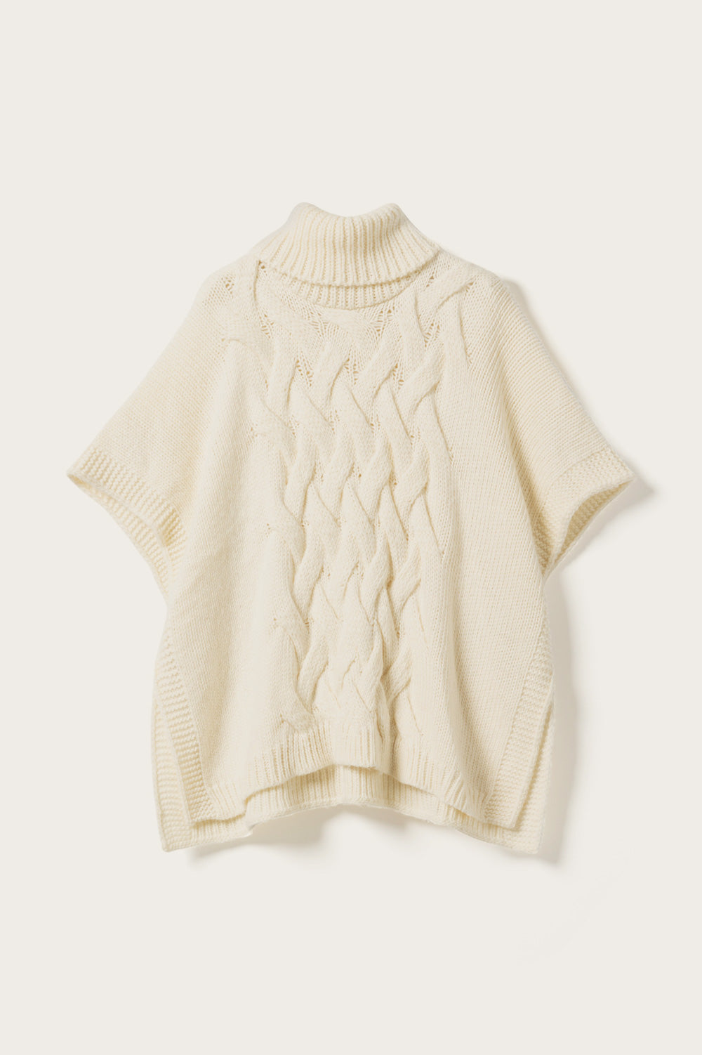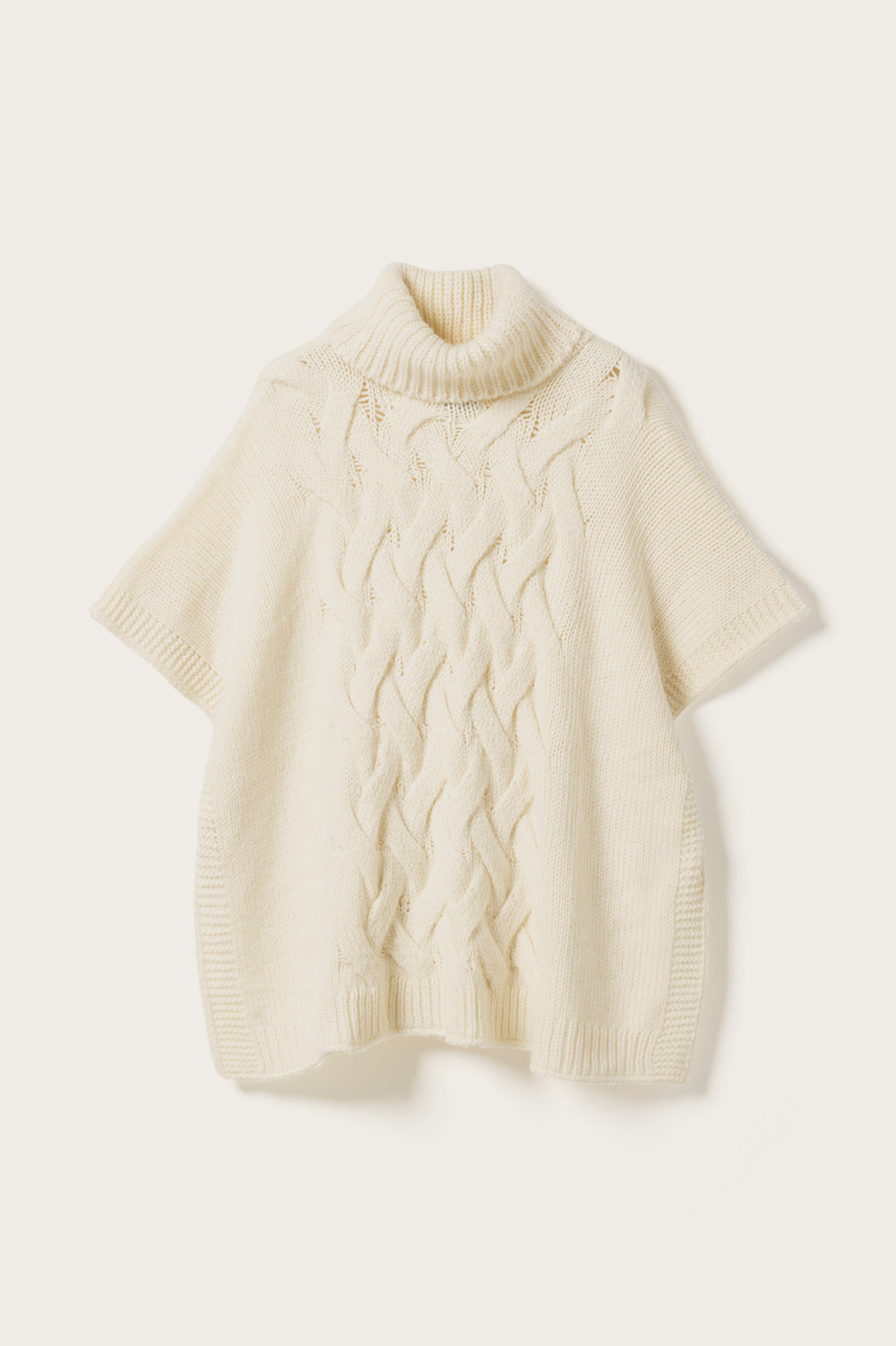 Laretha Knit er en oversized poncho med korte ermer i kabelstrikk og med høy rullekrage.