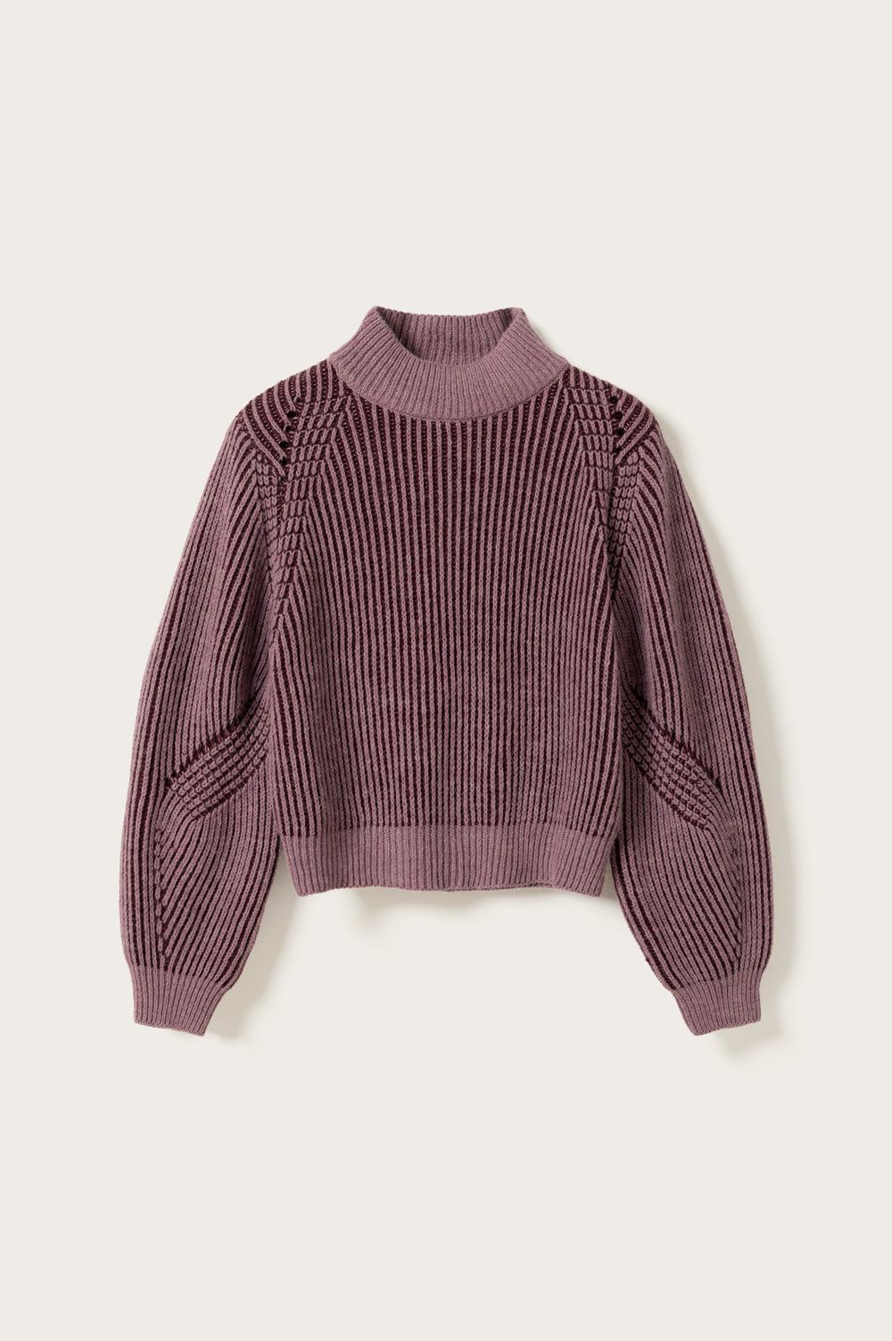 Lassie Knit er en stripet strikkegenser i løs passform med raglan-snitt, høy ribbestrikket krage og ribbestrikkede ermekanter.