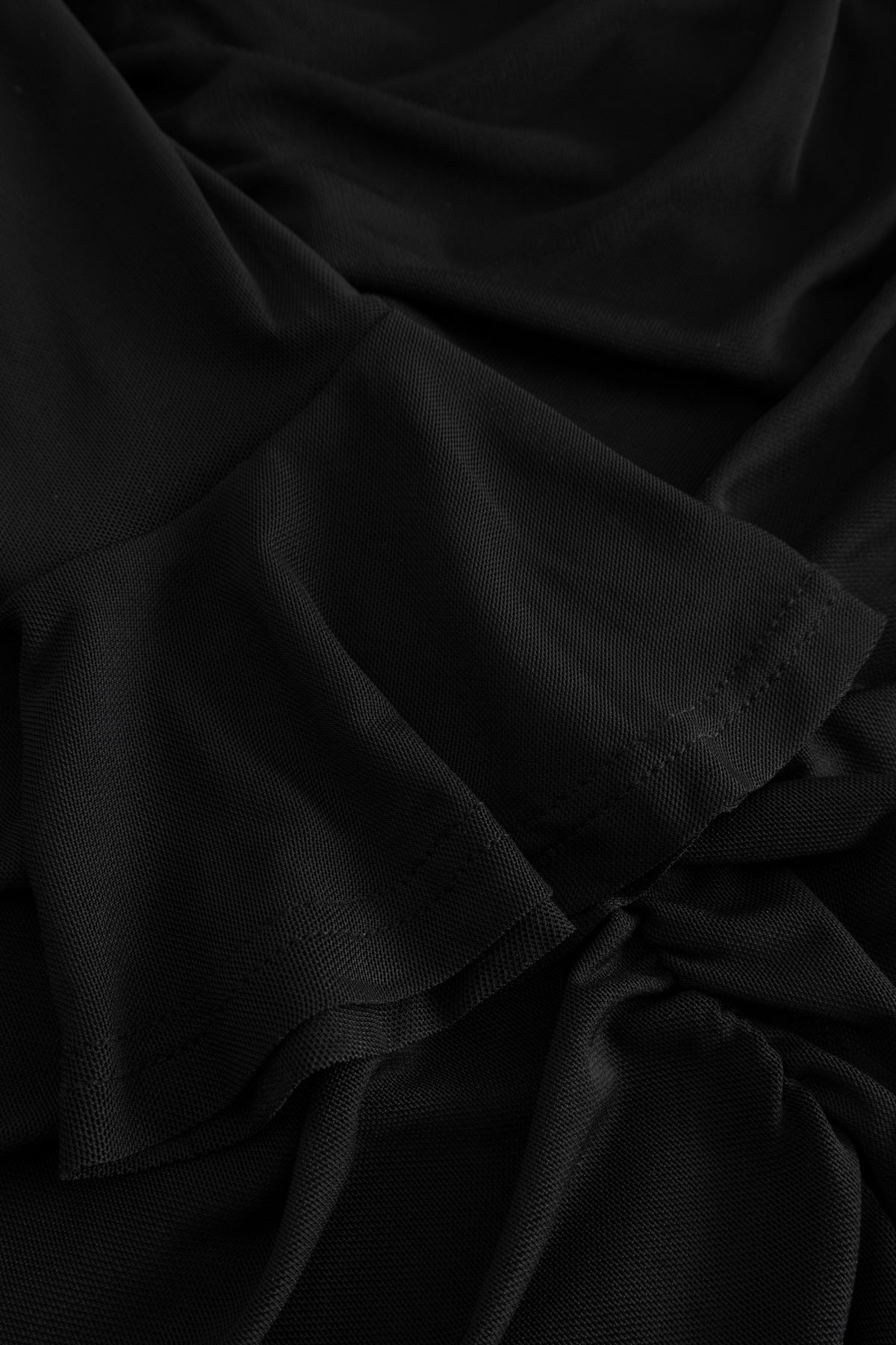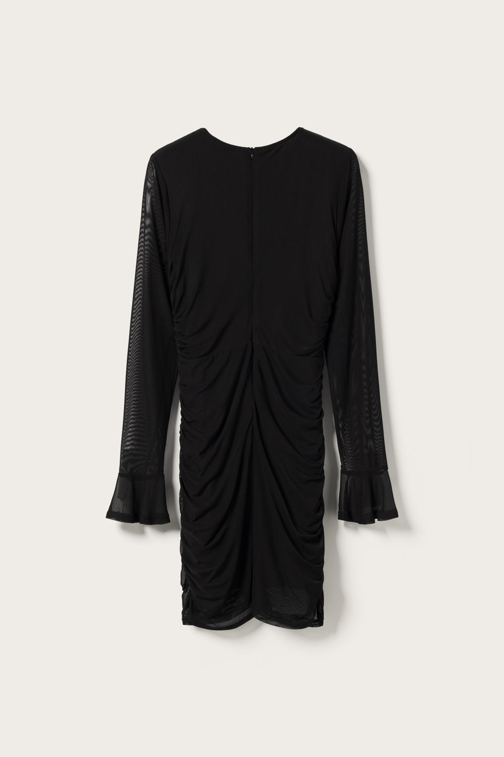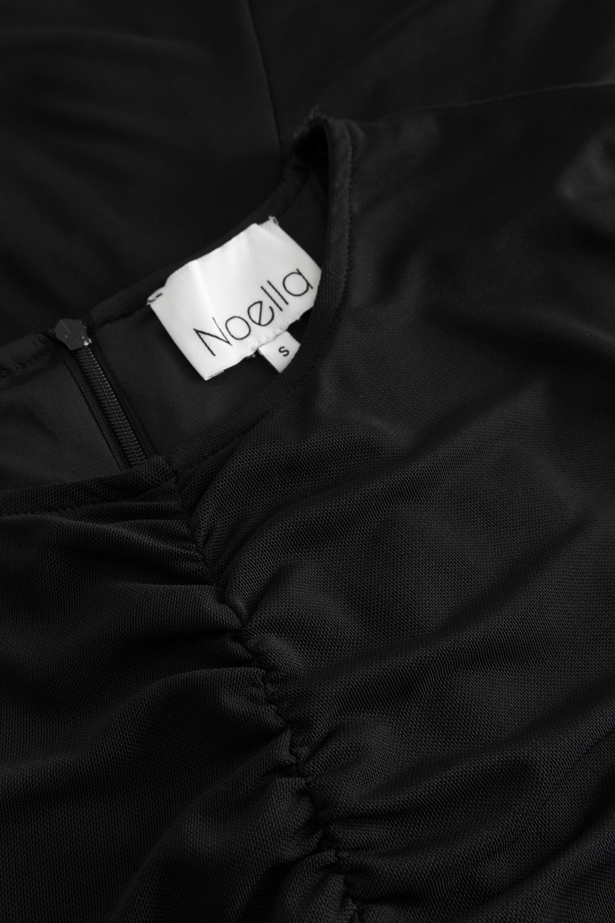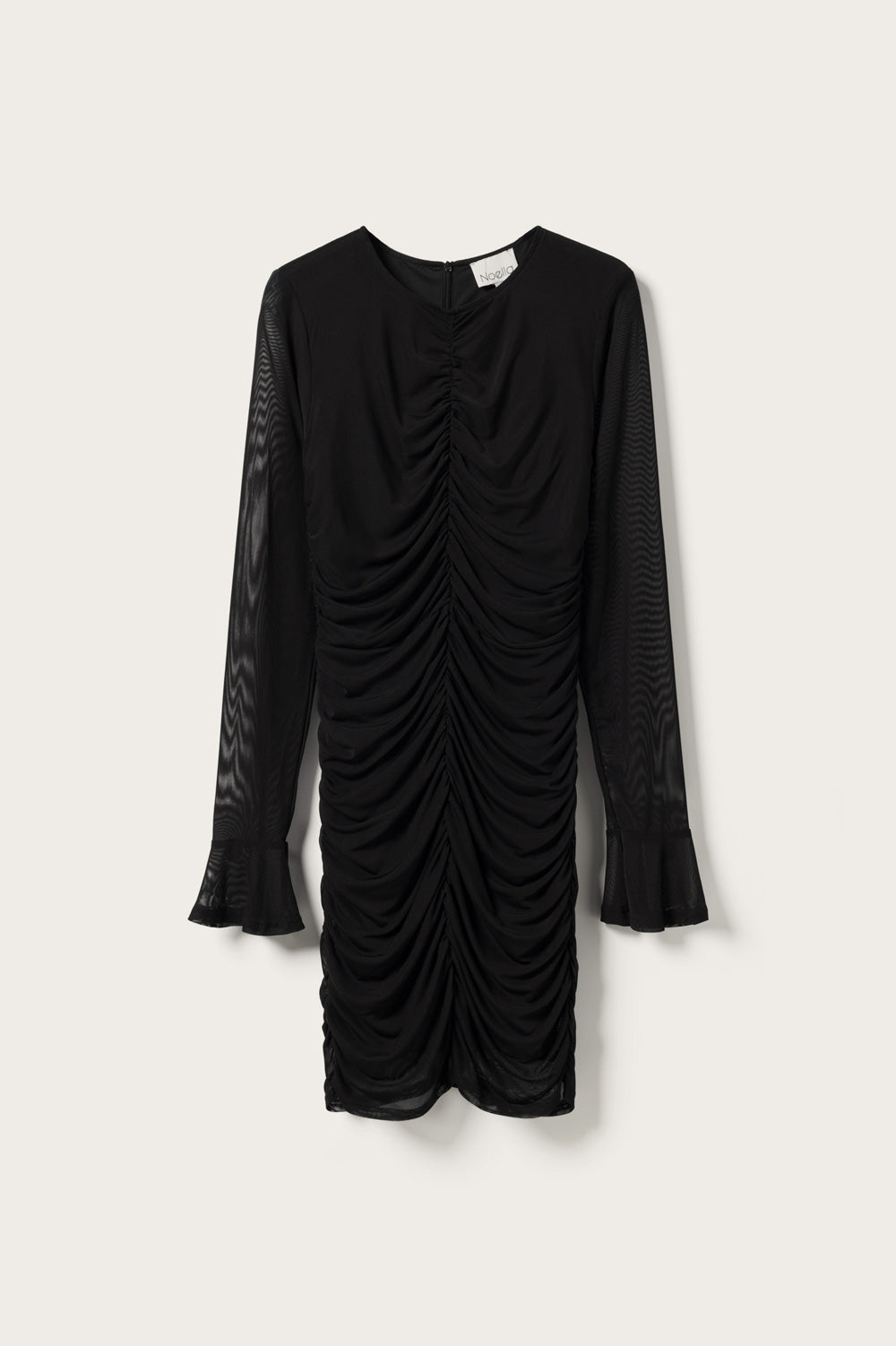 Lavetta Dress er en klassisk svart meshkjole med rynkedetaljer i sidene og foran. Kjolen har en tettsittende passform med smale ermer i gjennomsiktig mesh og brede mansjetter.