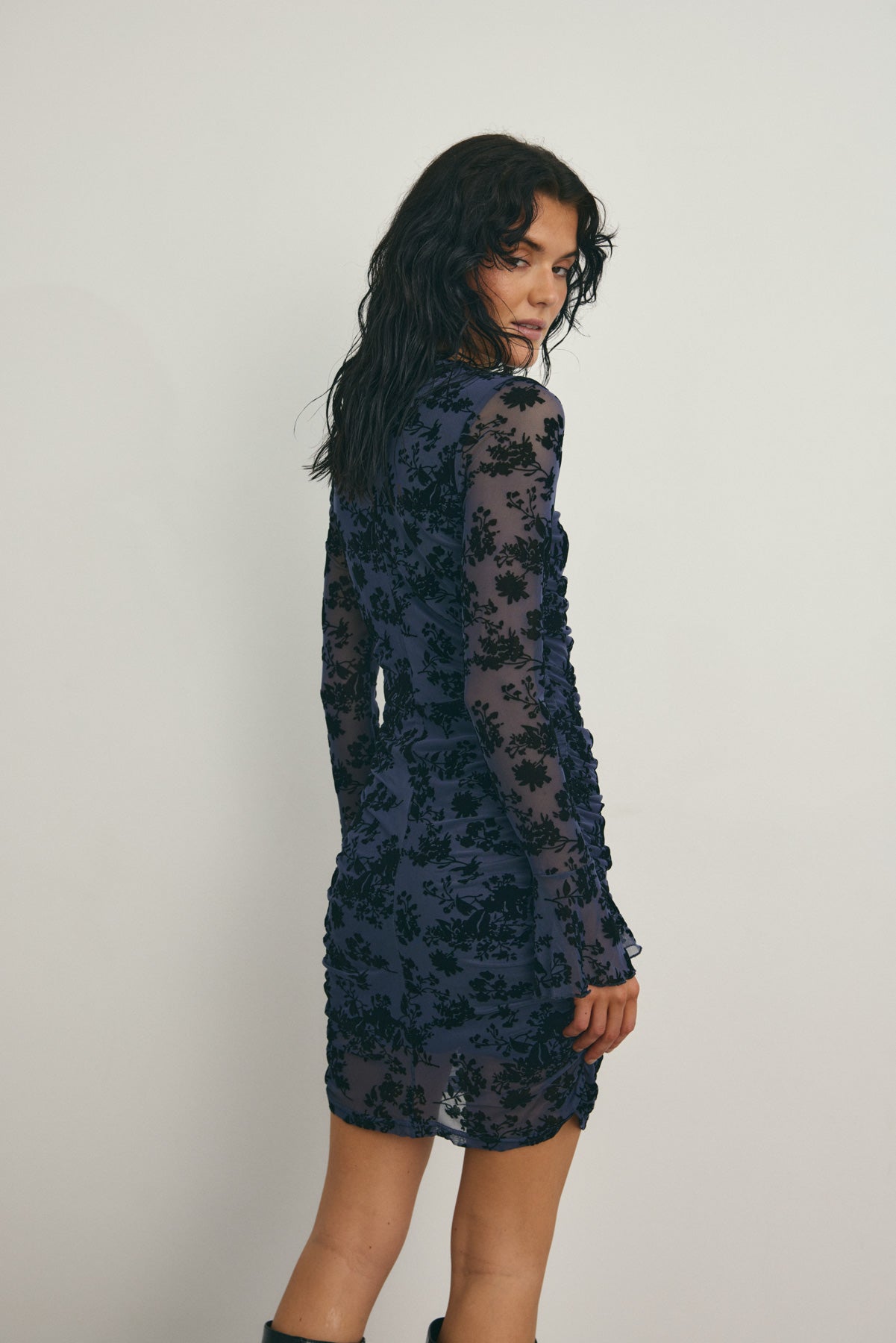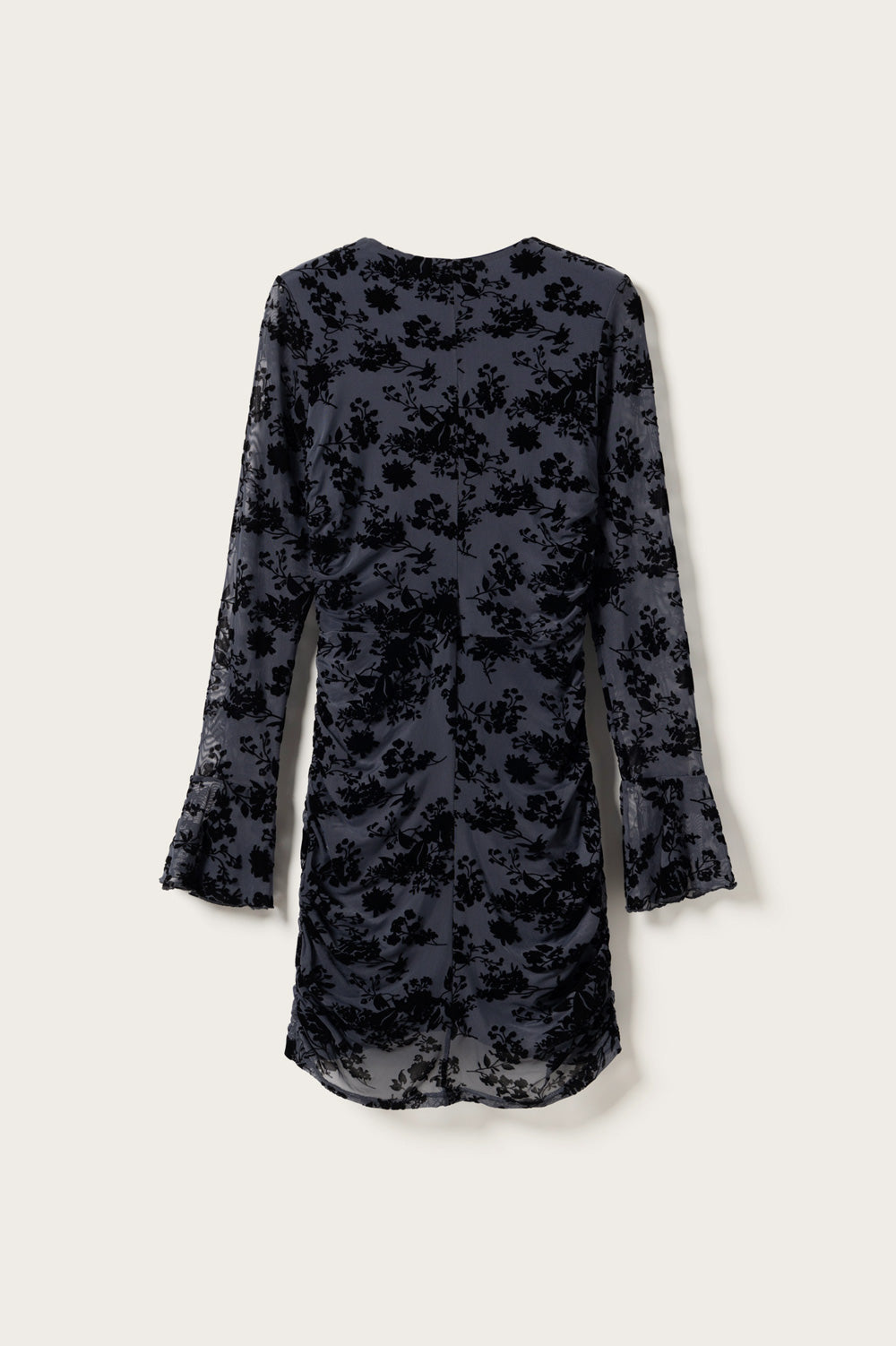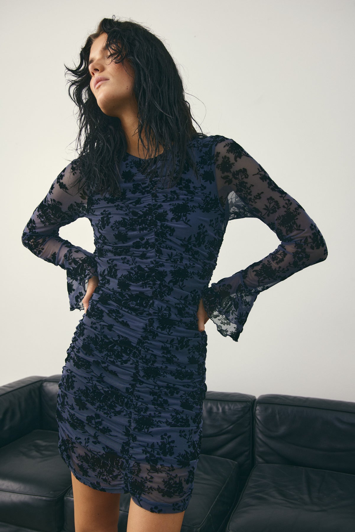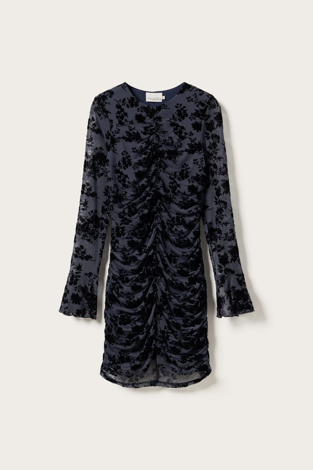 Lavetta Dress er en figursydd kjole med rynkedetaljer langs kroppen, brede mansjetter og integrert blomsterprint i stoffet.