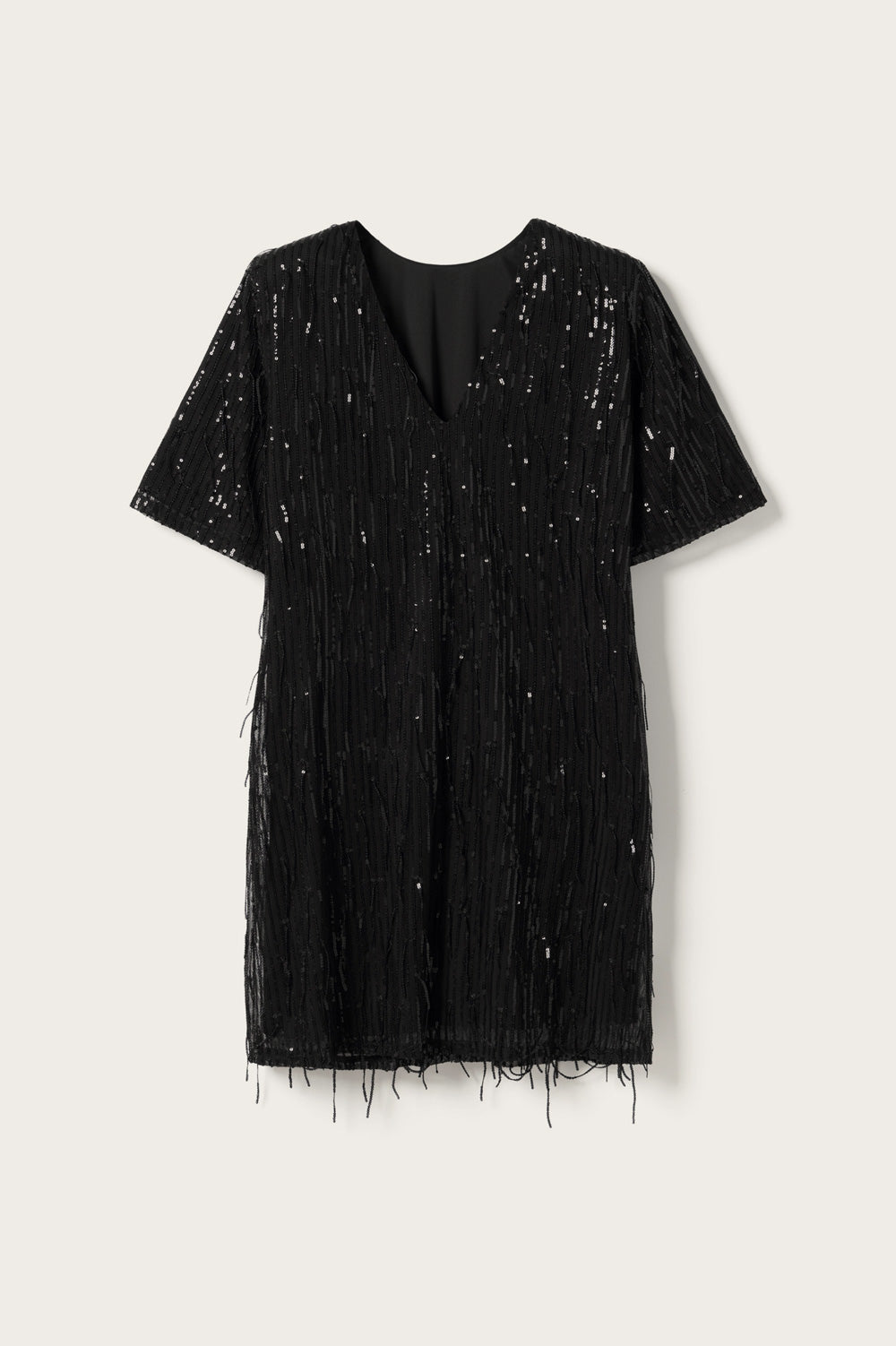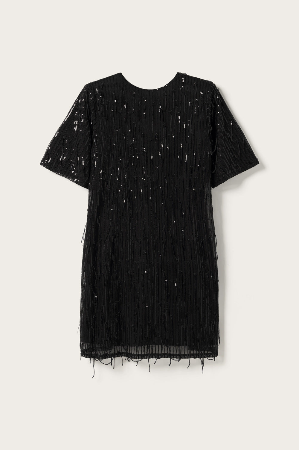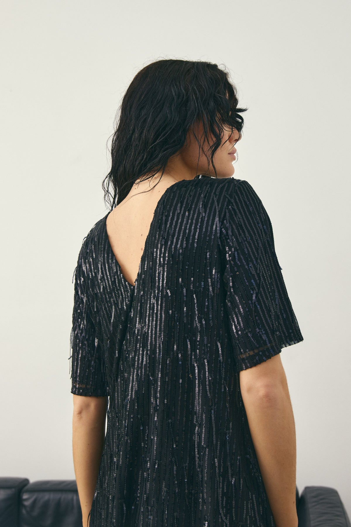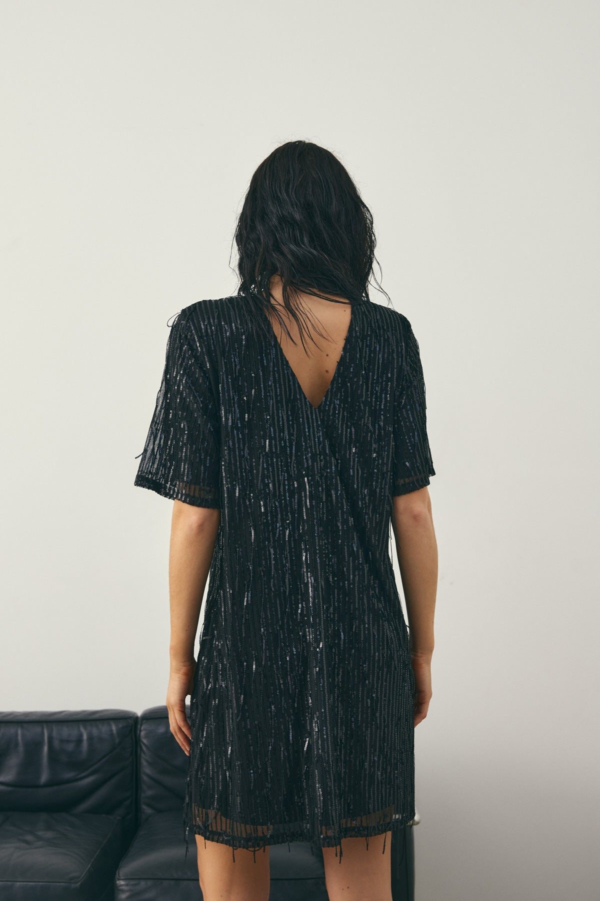 Leeann Dress er en kort T-skjortekjole med paljetter og dyp V-utringning bak. Leeann Dress er perfekt til festlige anledninger og kan styles med hæler og en kul veske for en stilig partylook.