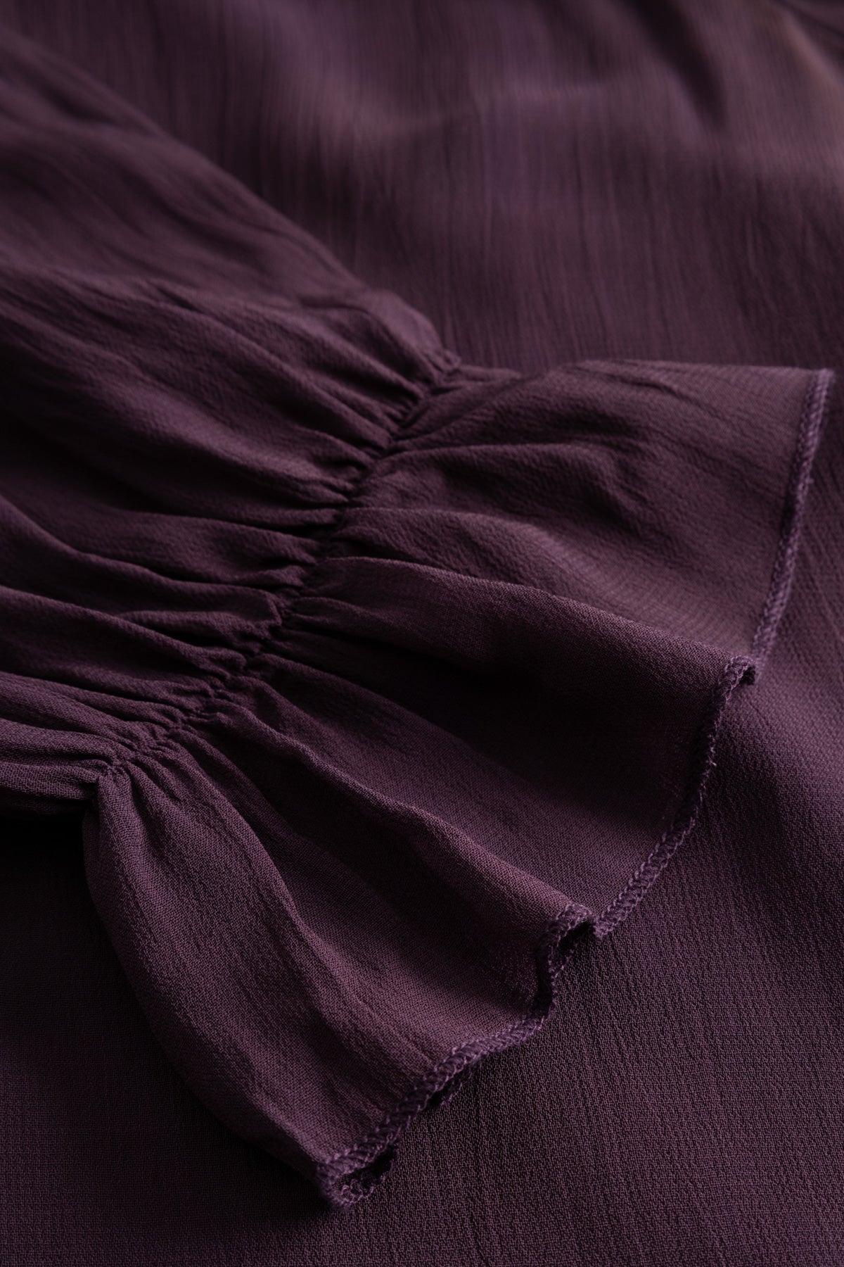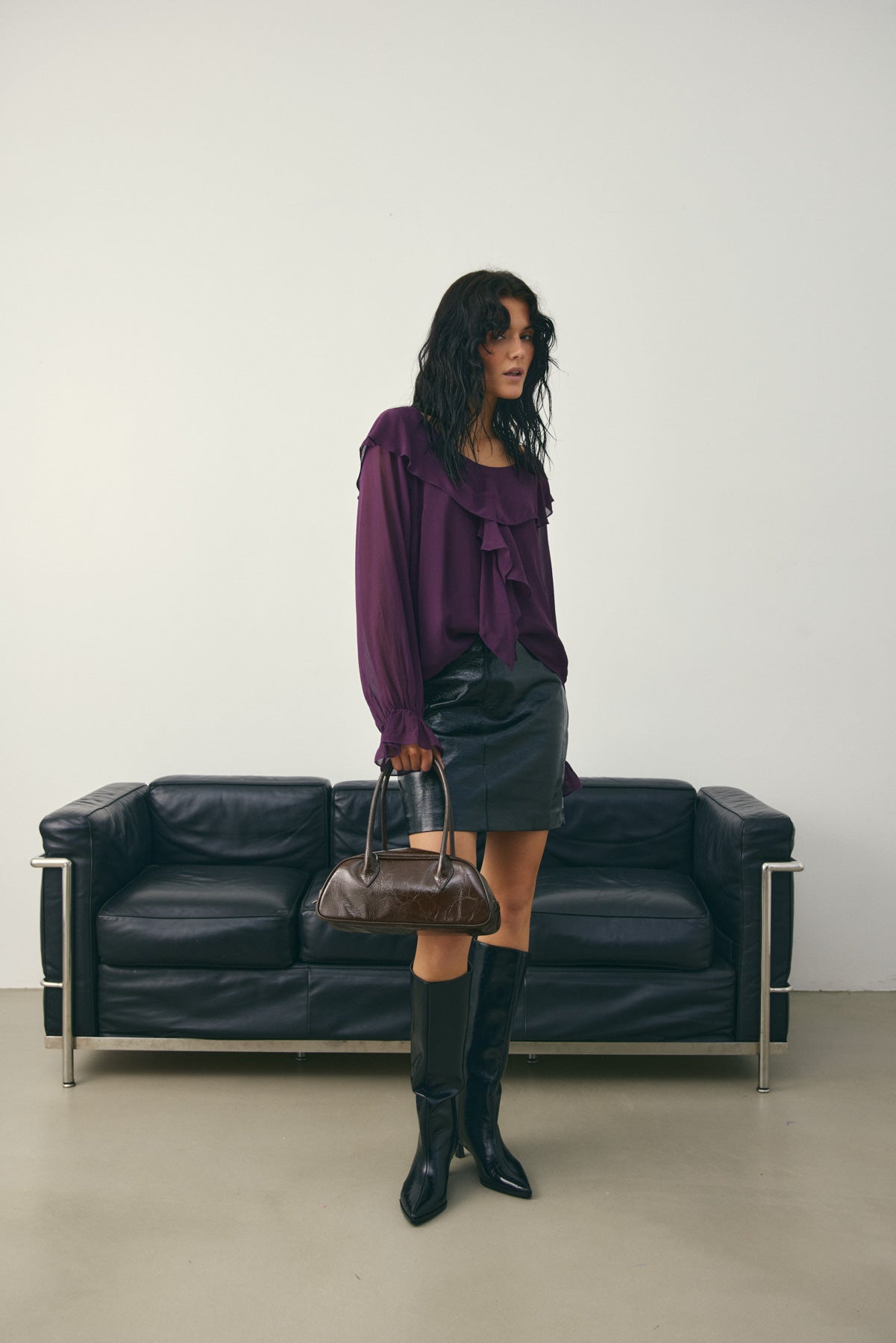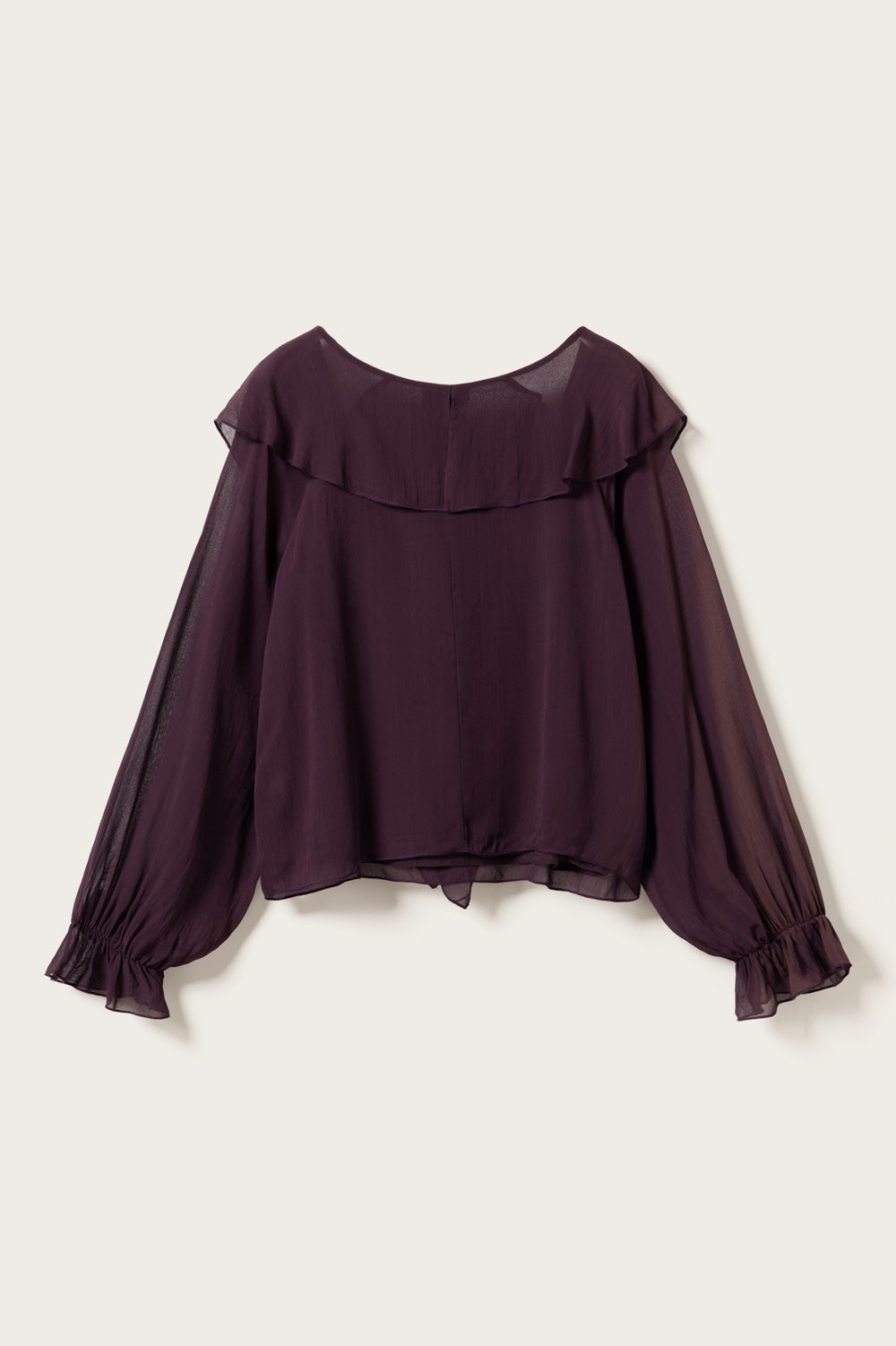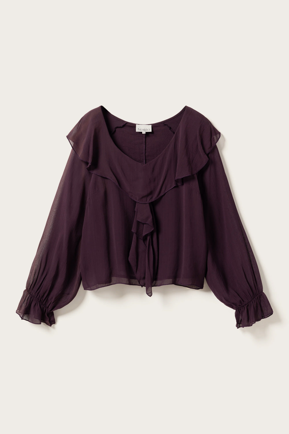 Leiana Blouse er en bluse med løs passform, volangdetaljer foran og strikkdetalj ved ermet.
