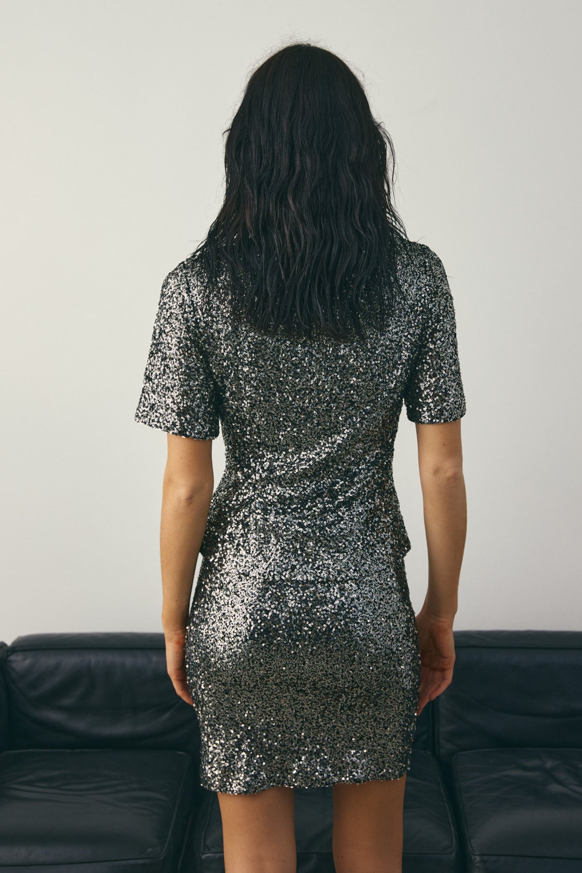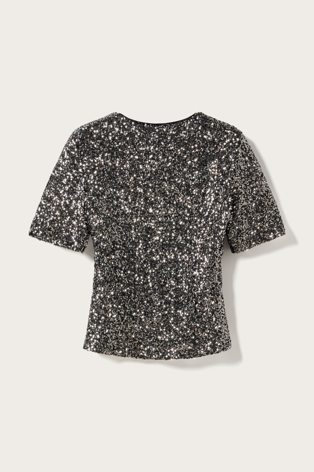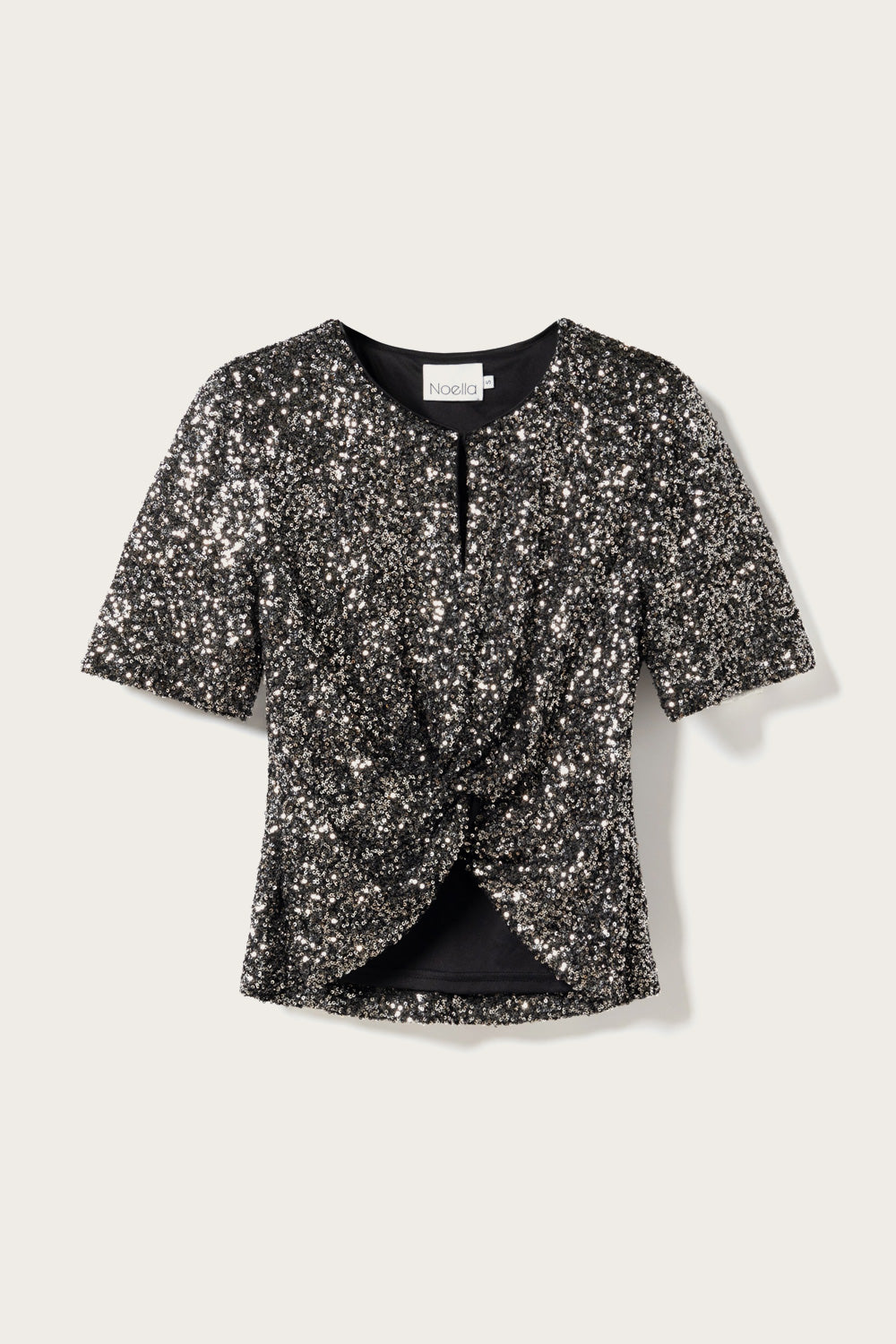 Lemon Blouse er en vridd T-skjorte med paljetter og splitt midt på fronten. Perfekt til festlige anledninger, kan styles med høytlivede bukser eller skjørt for et partylook.