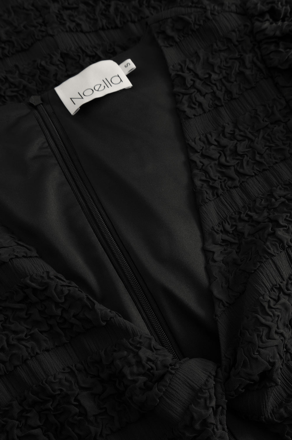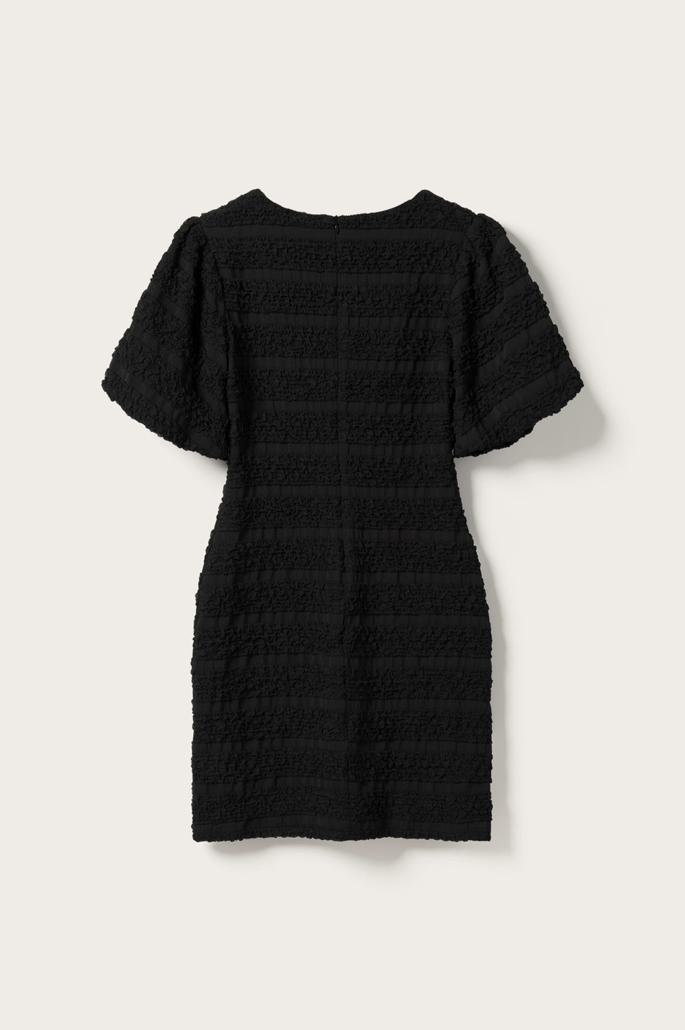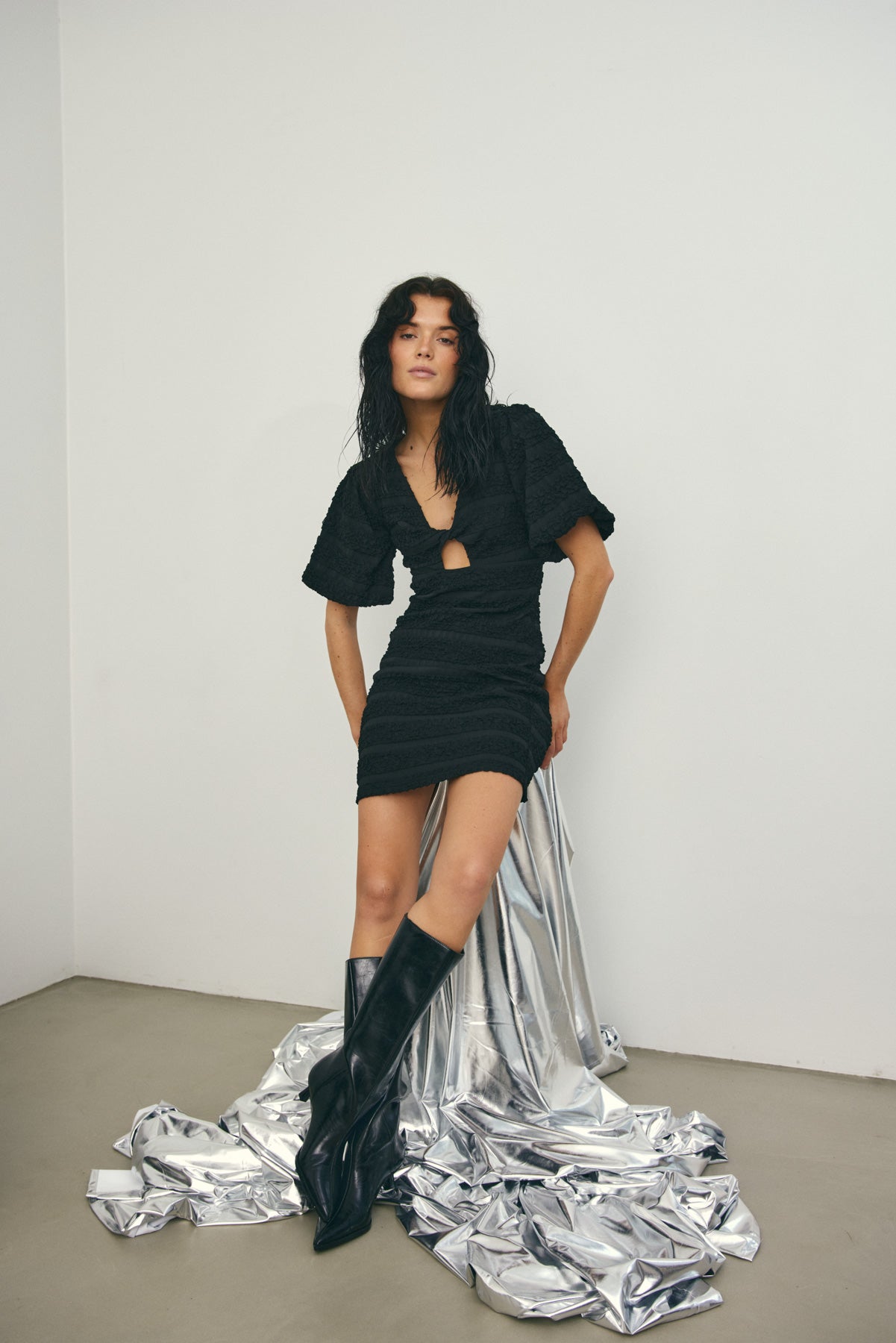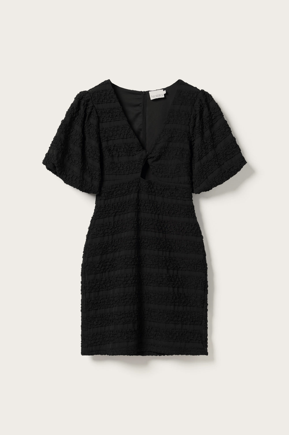 Lennice Dress er en kort kjole med voluminøse ballongermer og cutout midt foran. Perfekt til festlige anledninger og kan styles med hæler eller støvler for et moderne partylook.