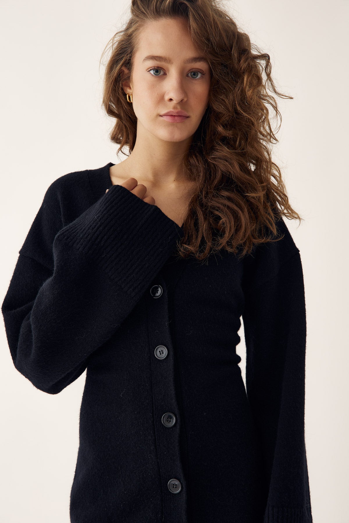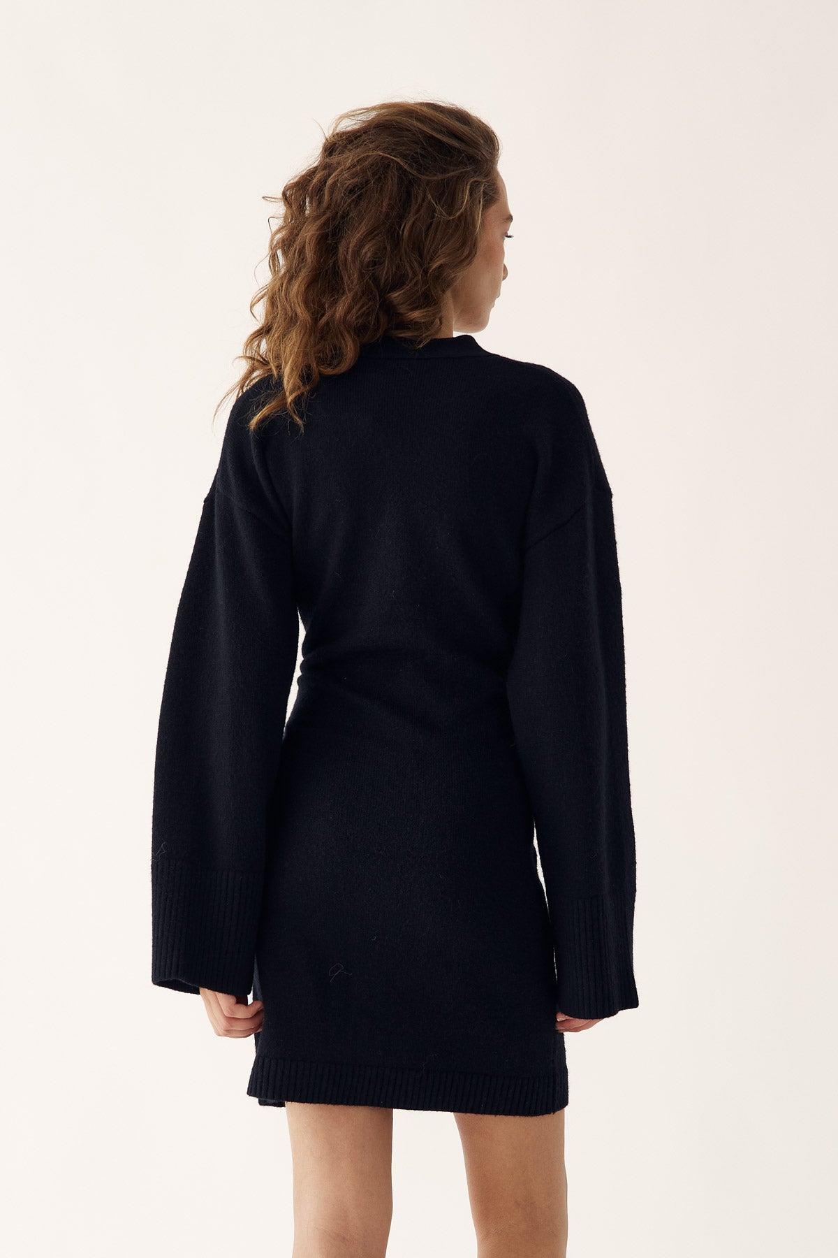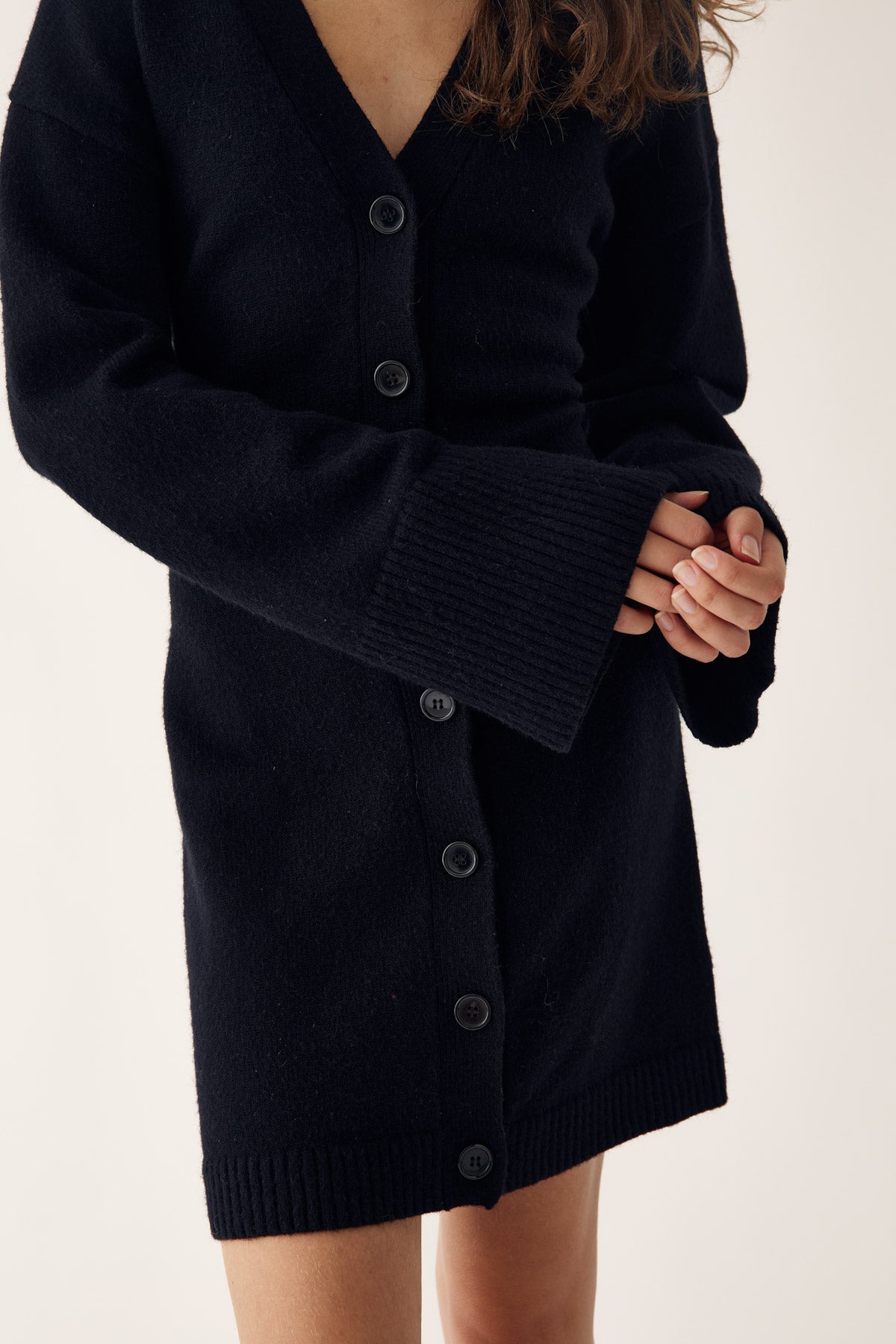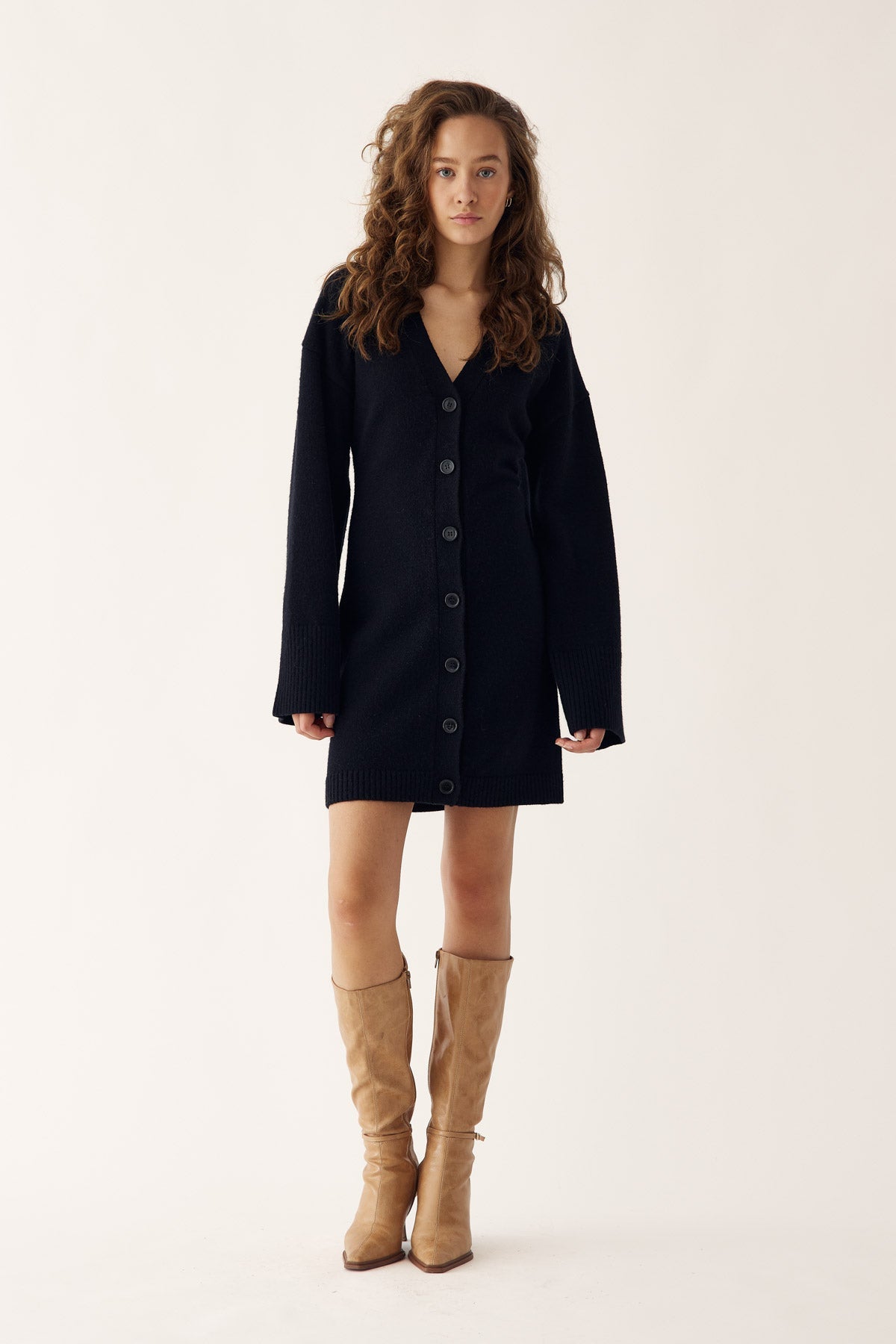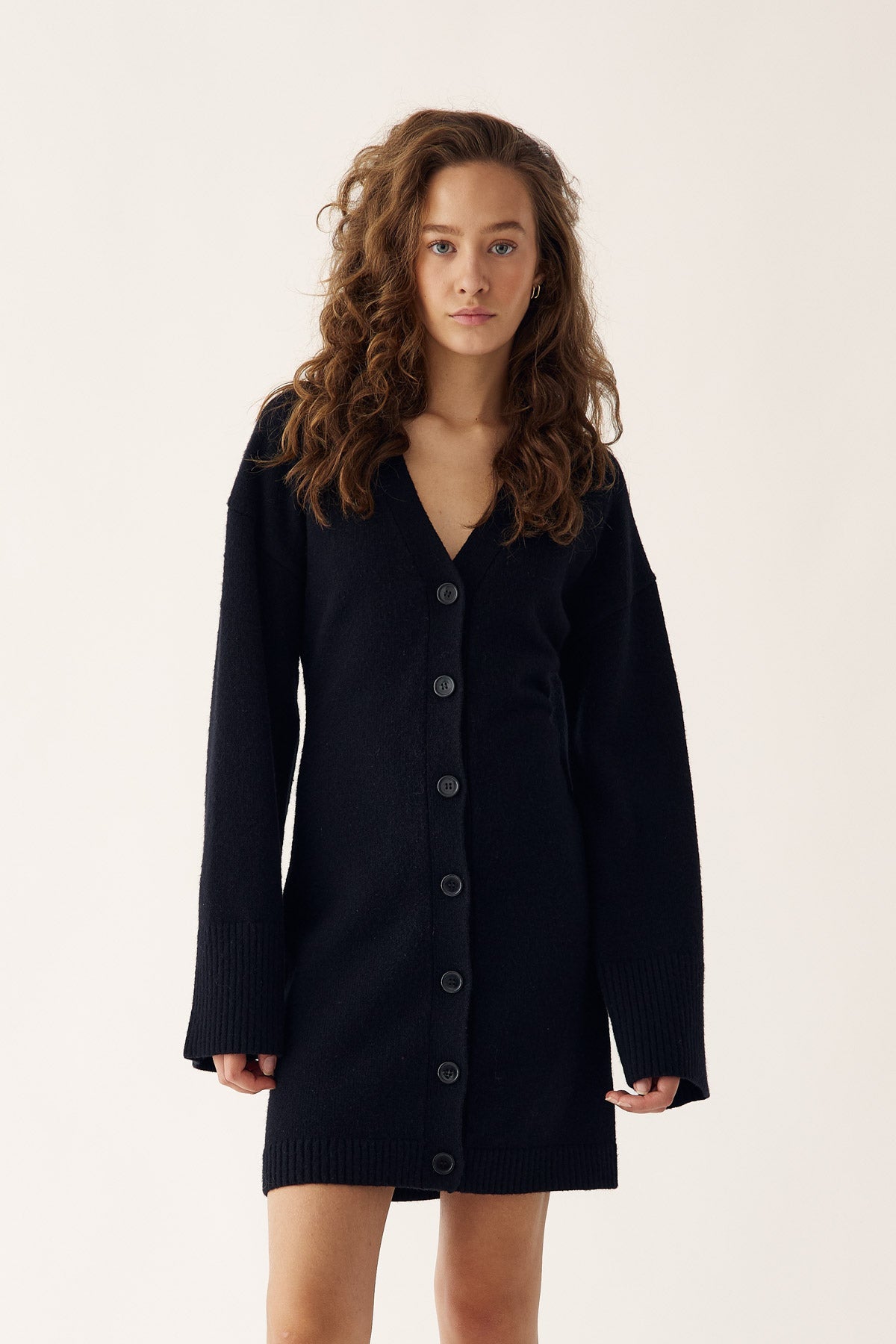 Lenyxanna Knit Dress er en cardigankjole med en tettsittende passform, lange voluminøse ermer og knappelukking foran.