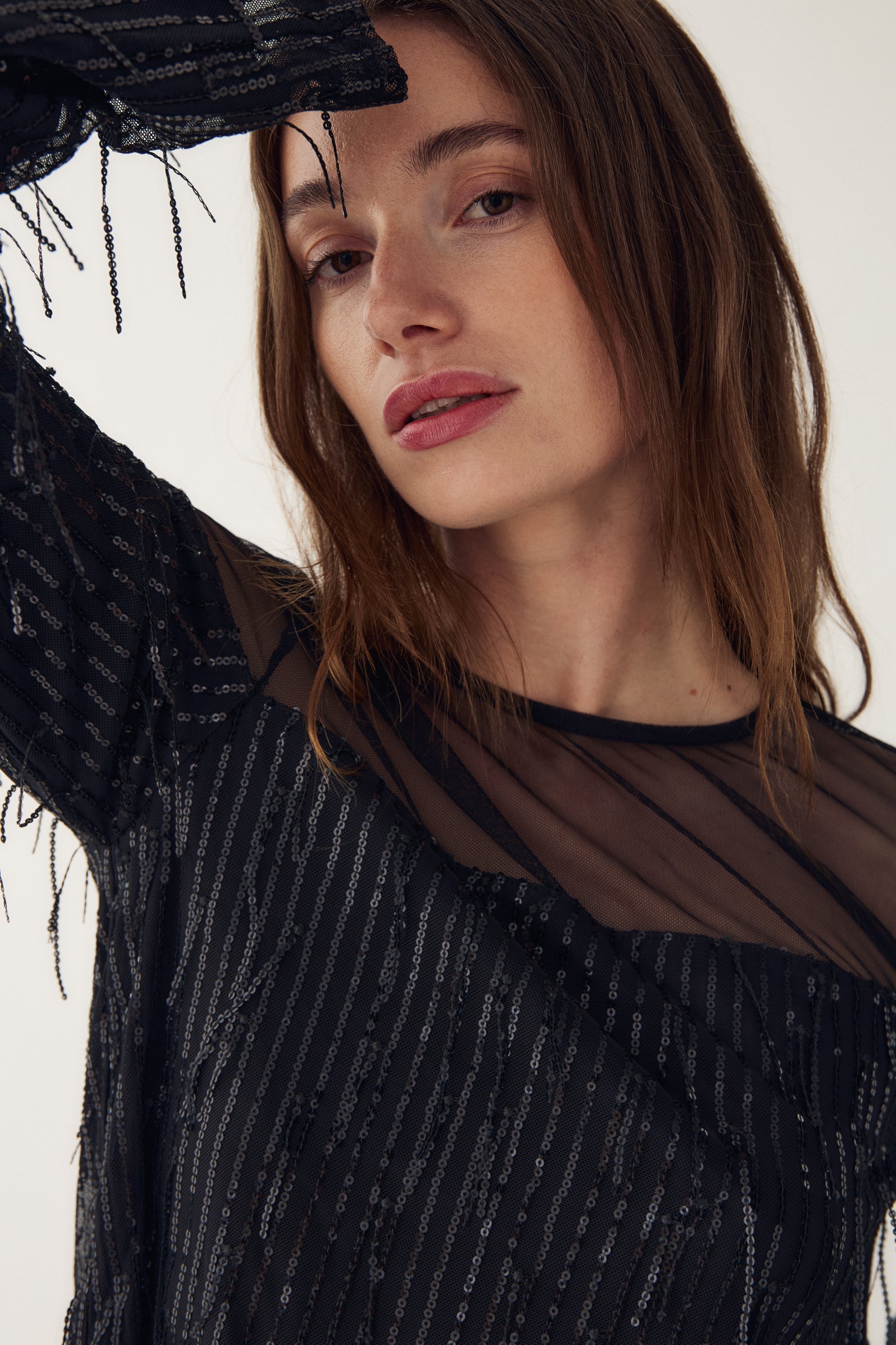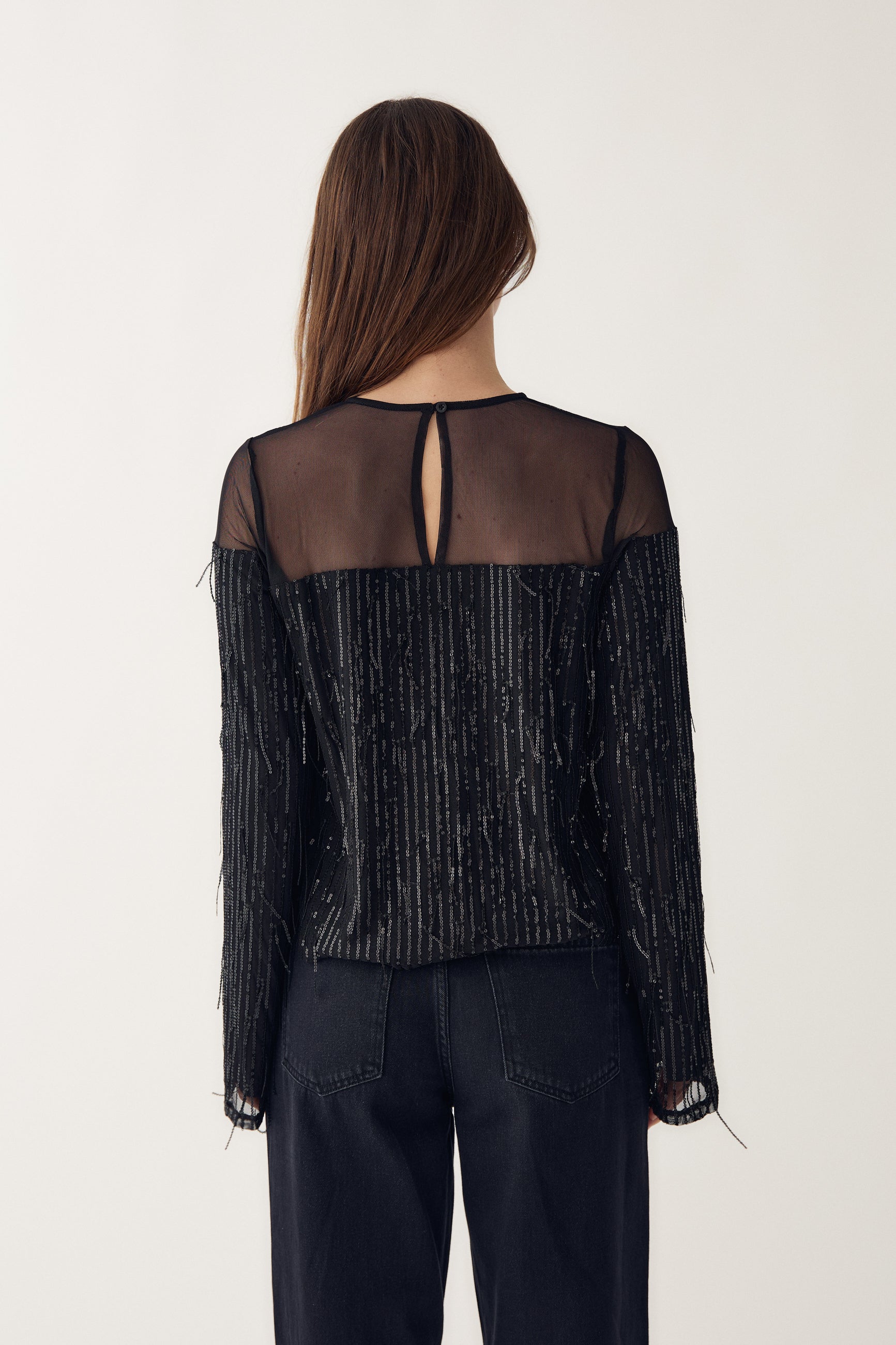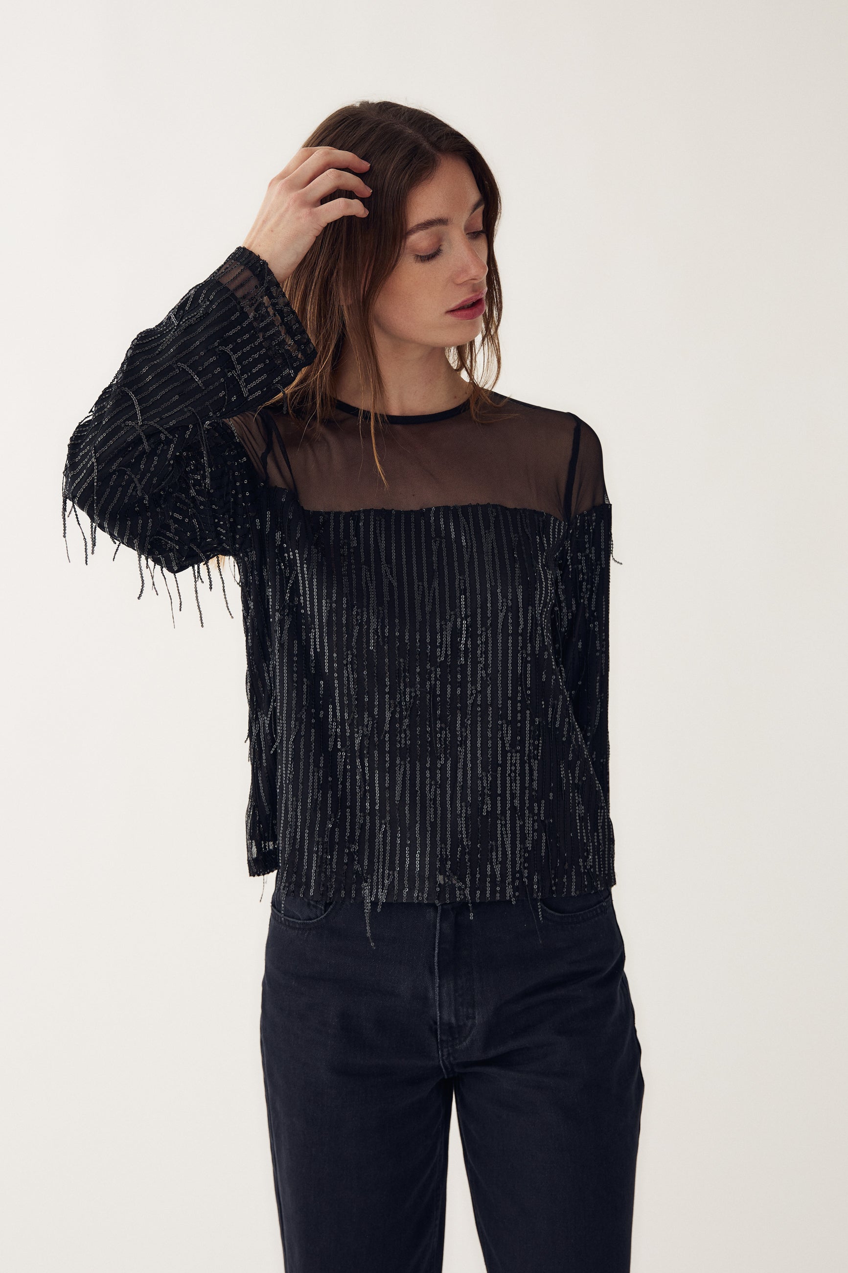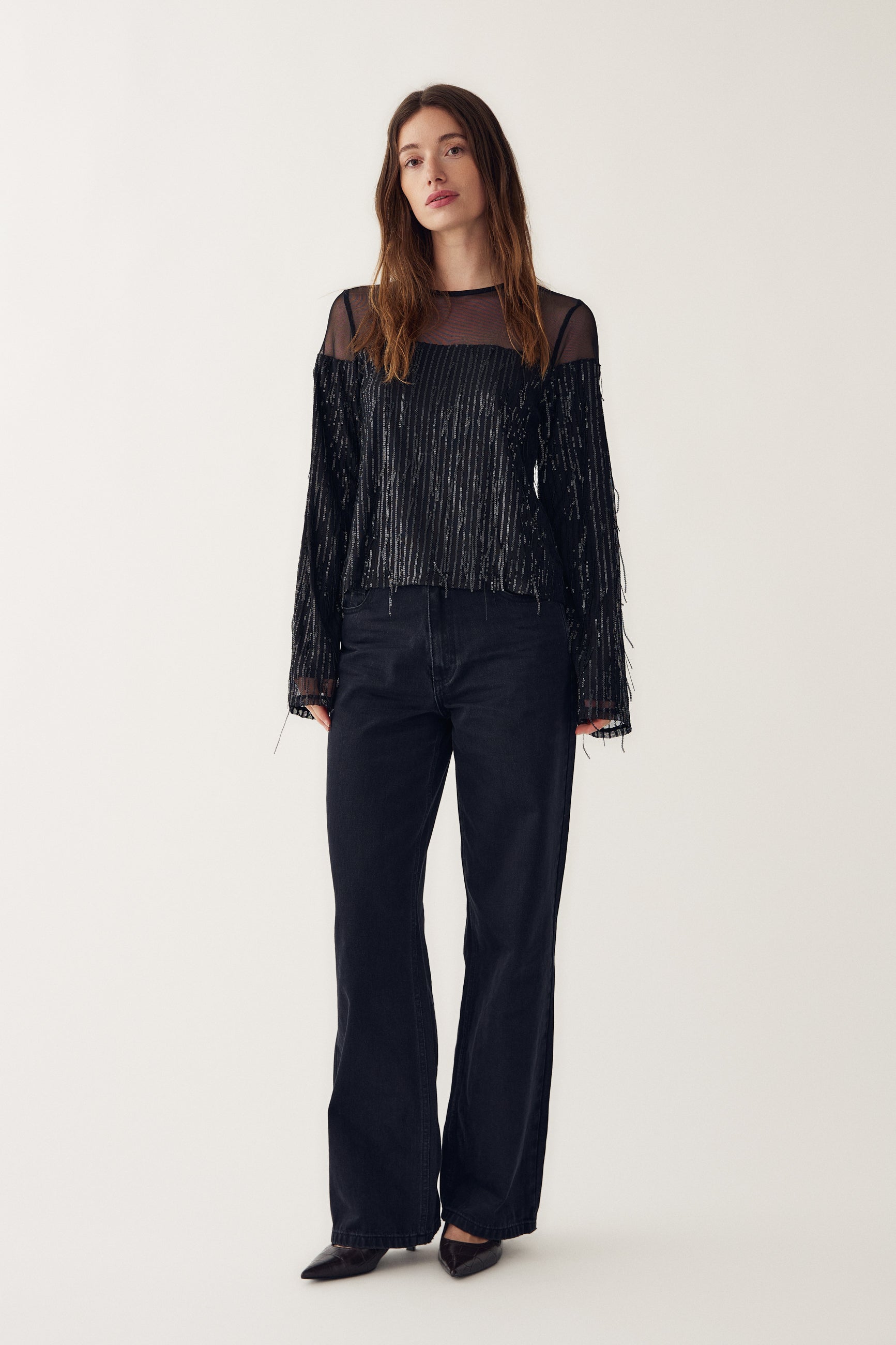 Leoda Top er en topp med lange ermer, paljetter og mesh-detalj ved bærestykket. Leoda Top er perfekt til festlige anledninger og kan styles med skjørt eller bukser for et elegant partylook.