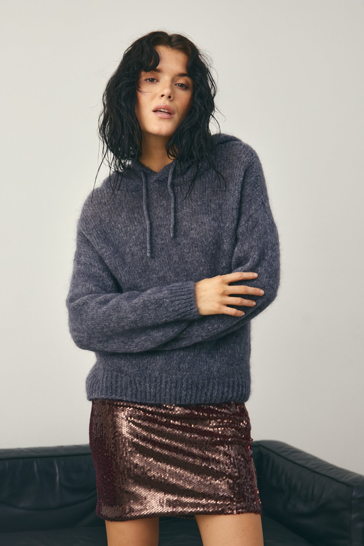 Leola Knit er en strikkegenser i løs passform med hette og snøring.