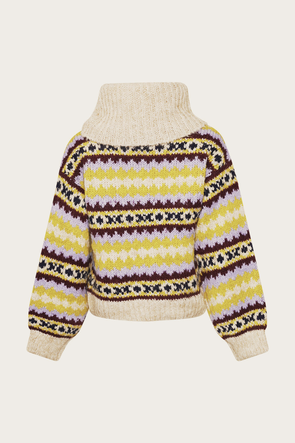 Lidija Knit er en strikkegenser i løs passform med høy rullekrage, ribbkanter og flerfarget mønster.