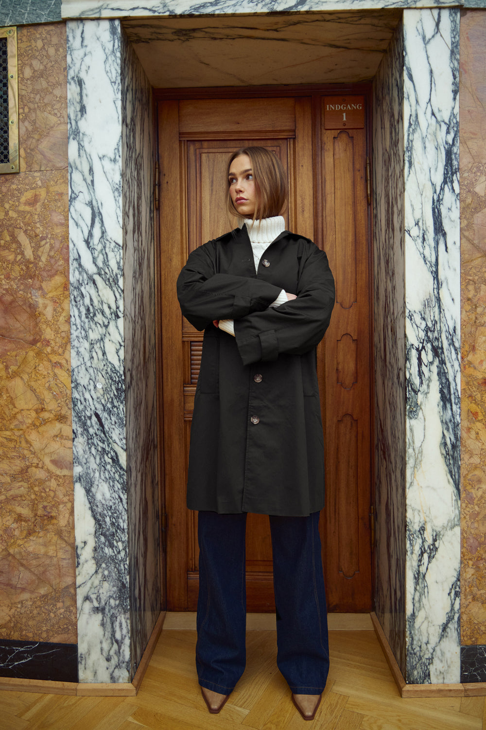 Lili Coat er en klassisk trenchcoat i 100 bomull med krage og store knapper samt knappdetaljer på ermene. Lili Coat har en mellombenlengde og en løs passform.