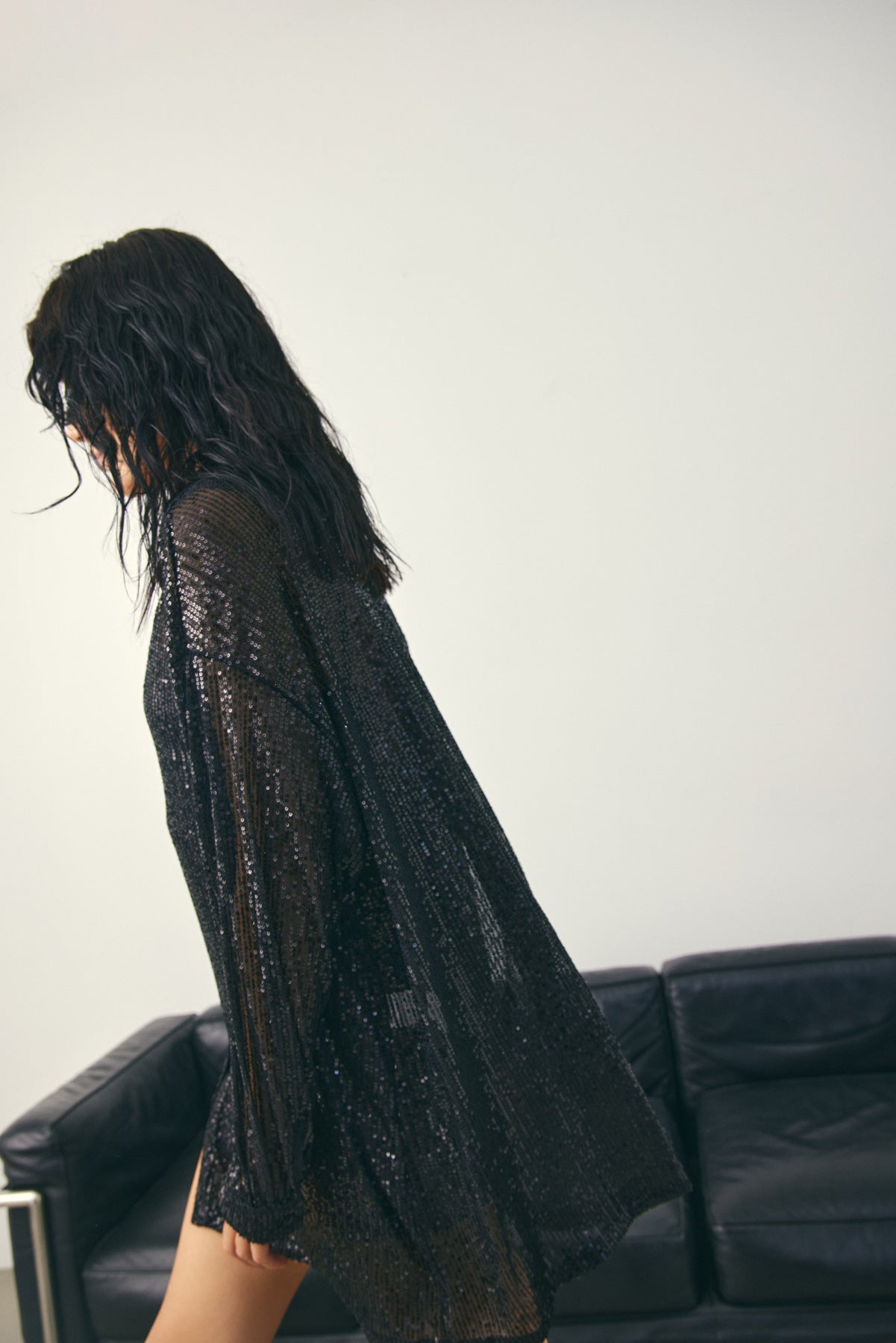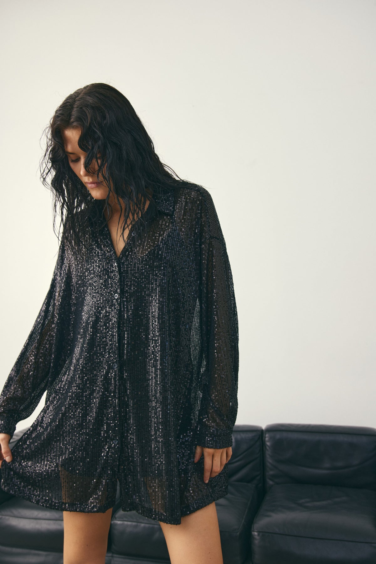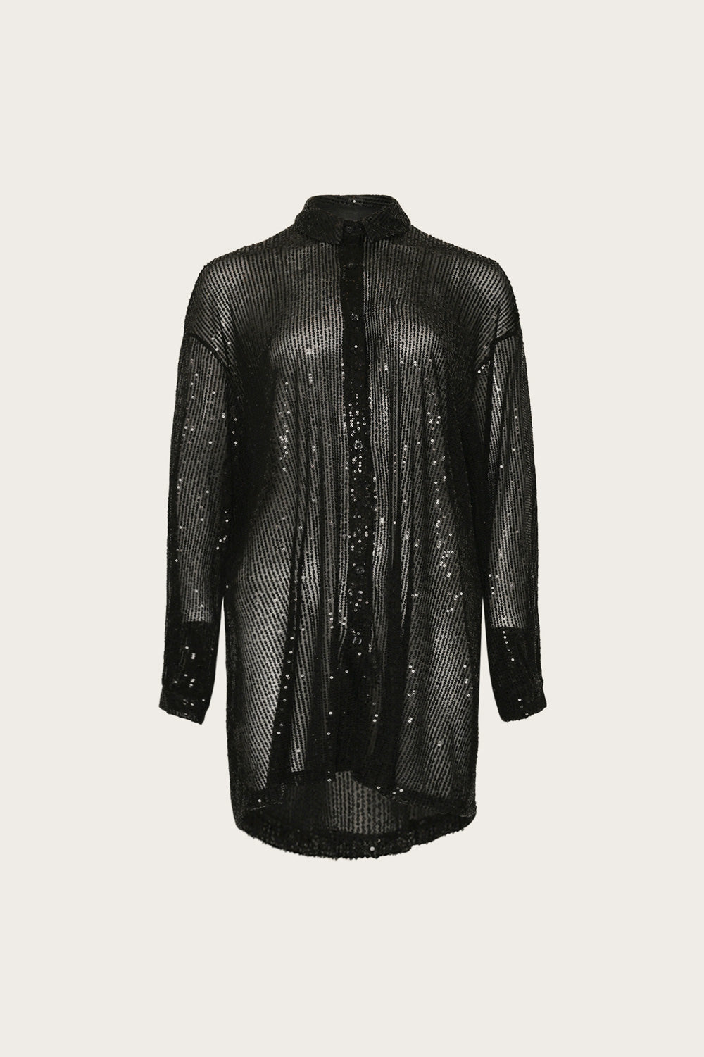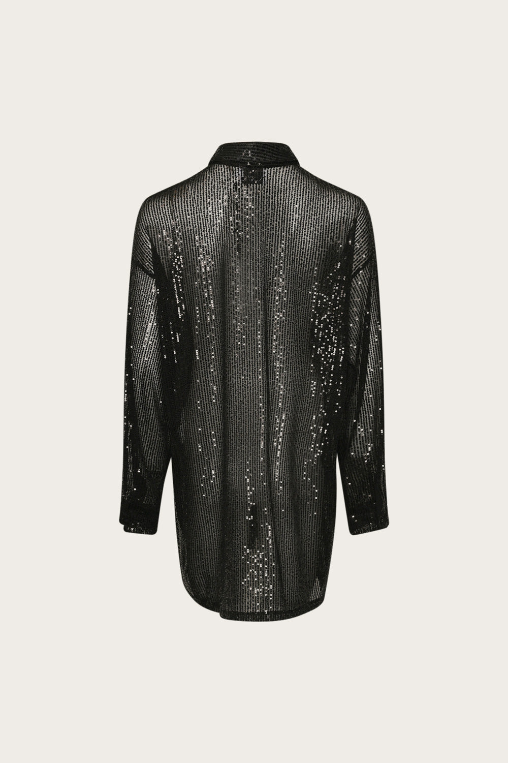 Lizanne Shirt er en paljettskjorte med lange ermer, klassisk krage, knappelukking og en løs passform.