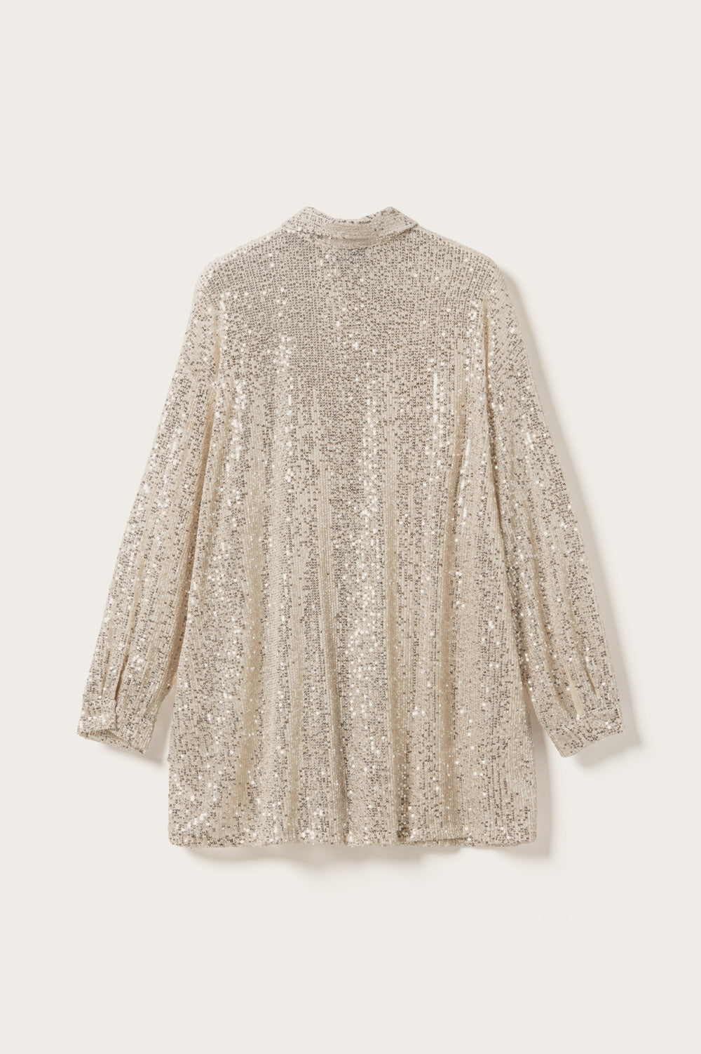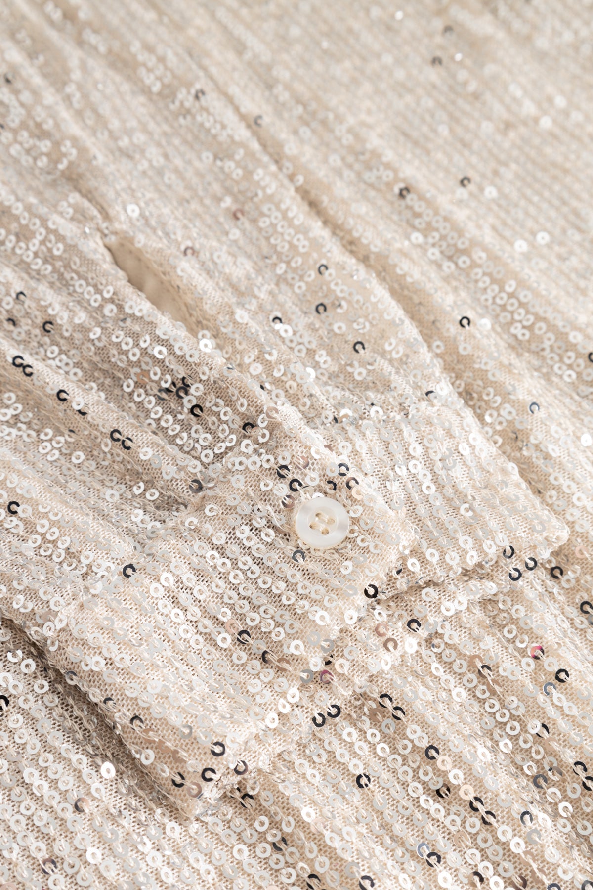 Lizanne Shirt er en paljettskjorte med lange ermer, klassisk krage, knappelukking og en løs passform.