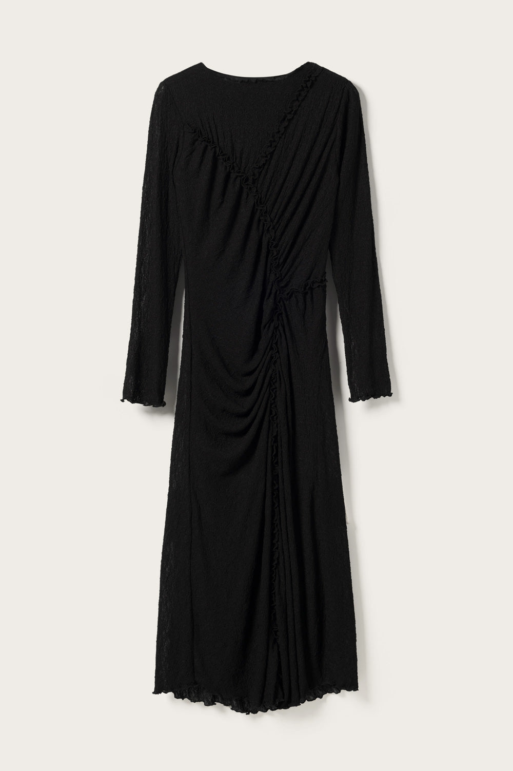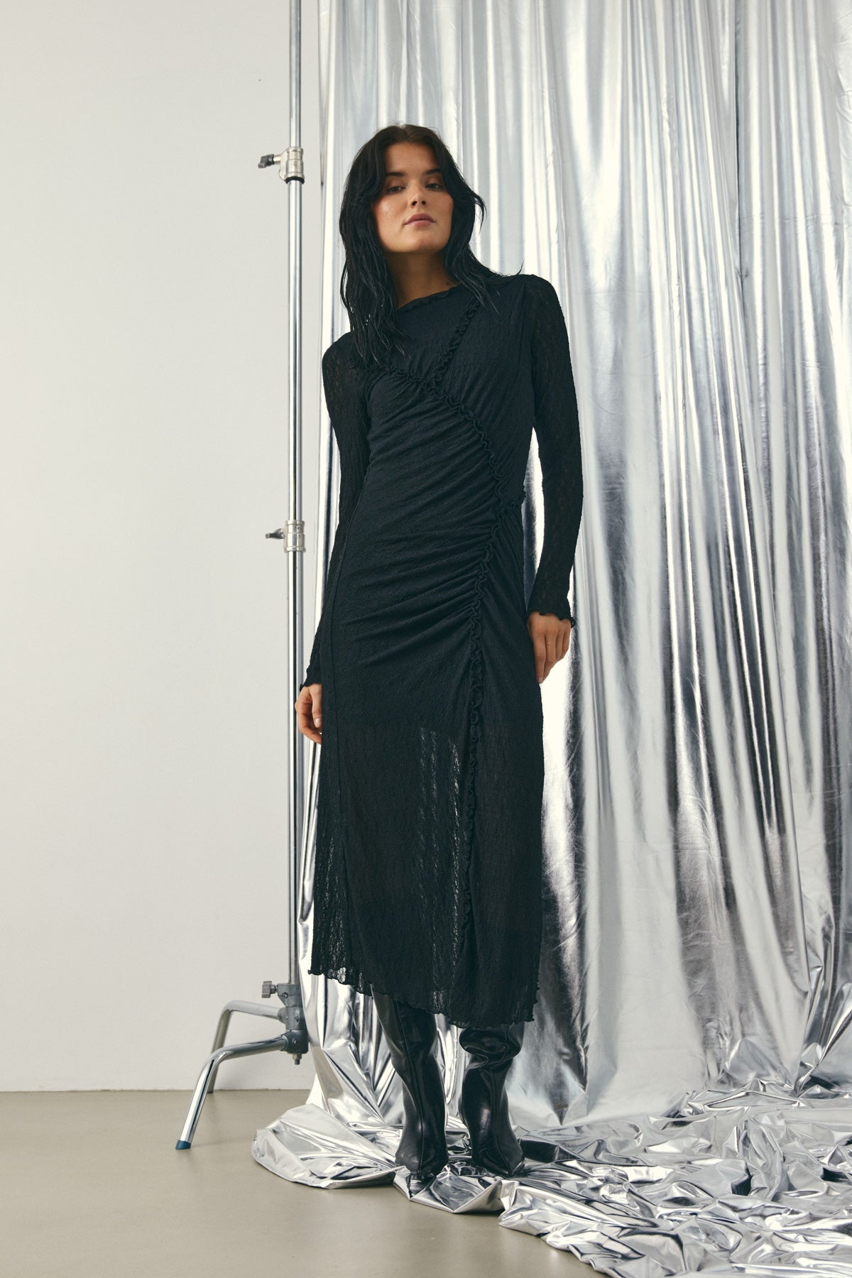 Loma Dress er en lang kjole med markert cutline og rynkedetaljer foran som fremhever silhuetten. Perfekt som den lille kjolen til festlige anledninger.