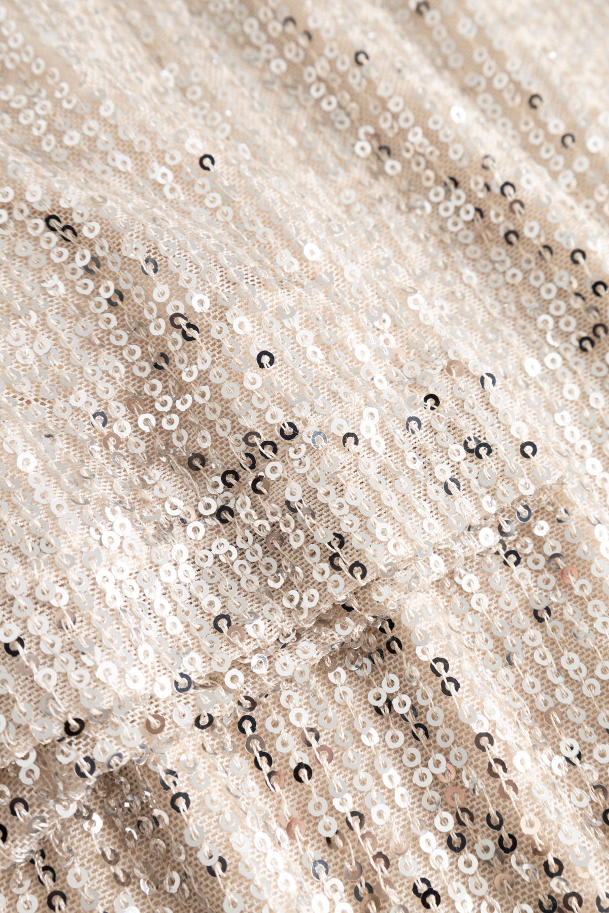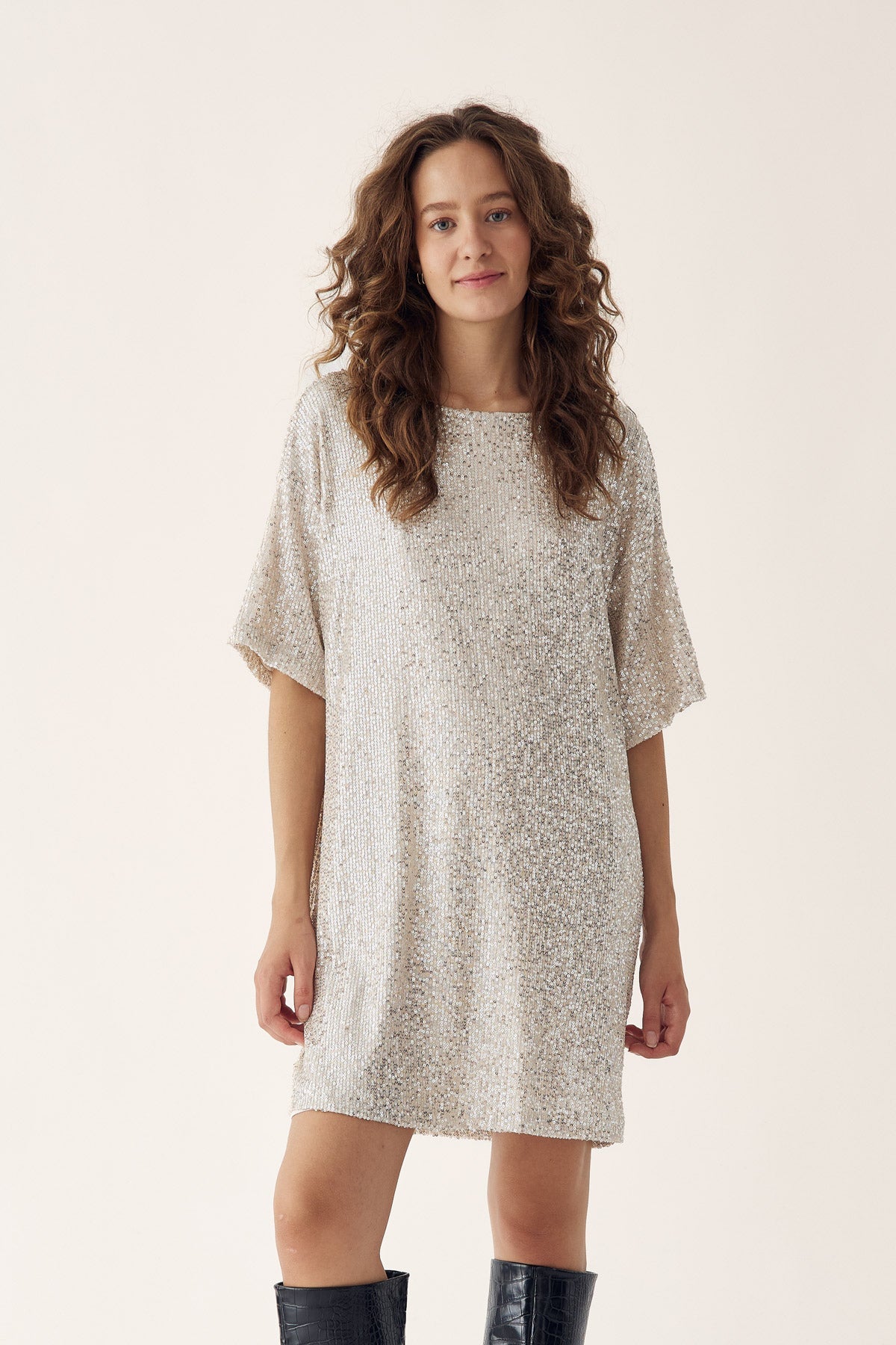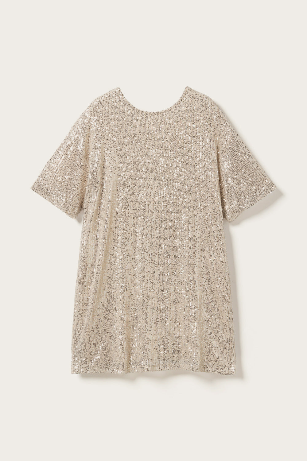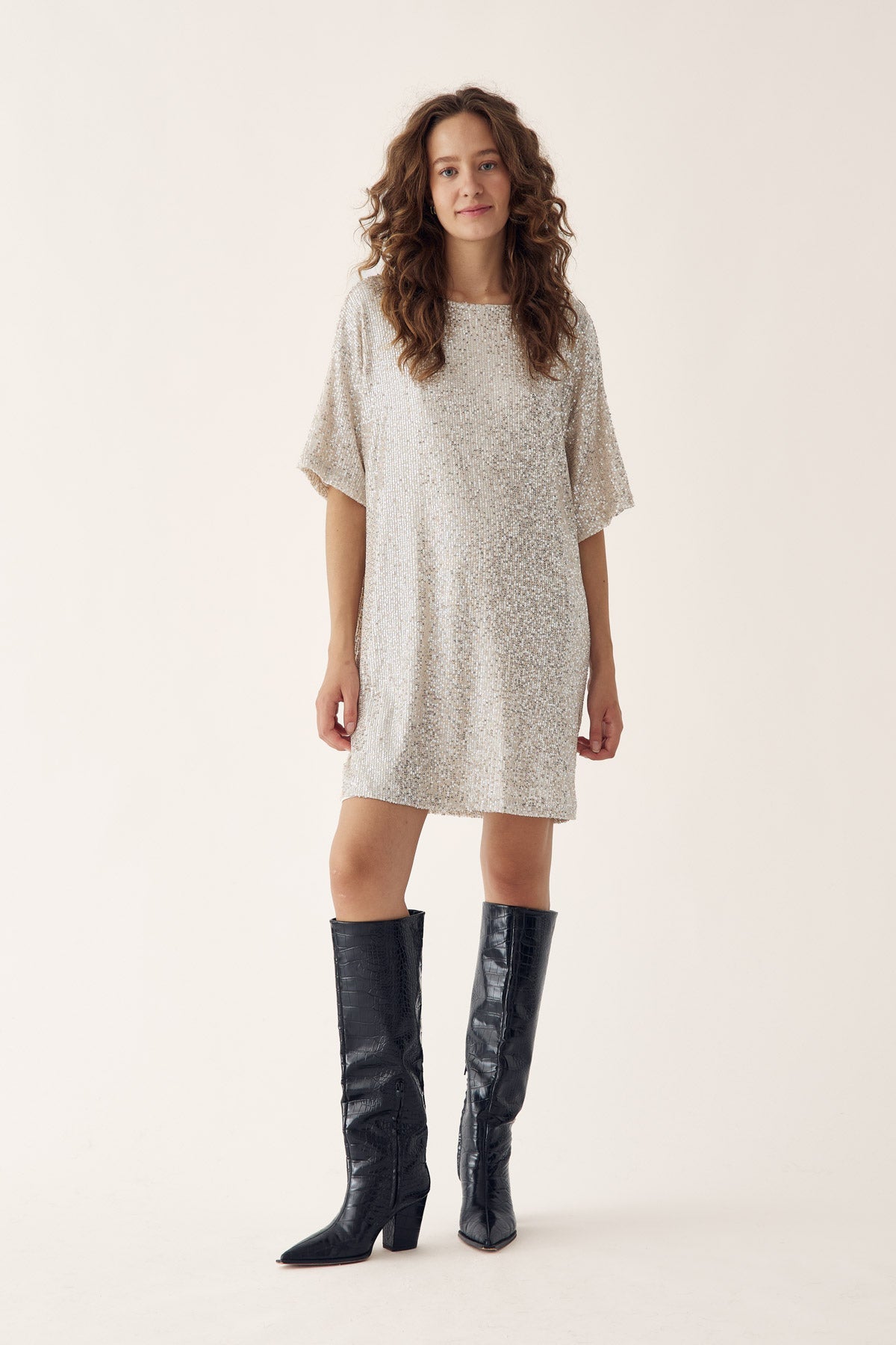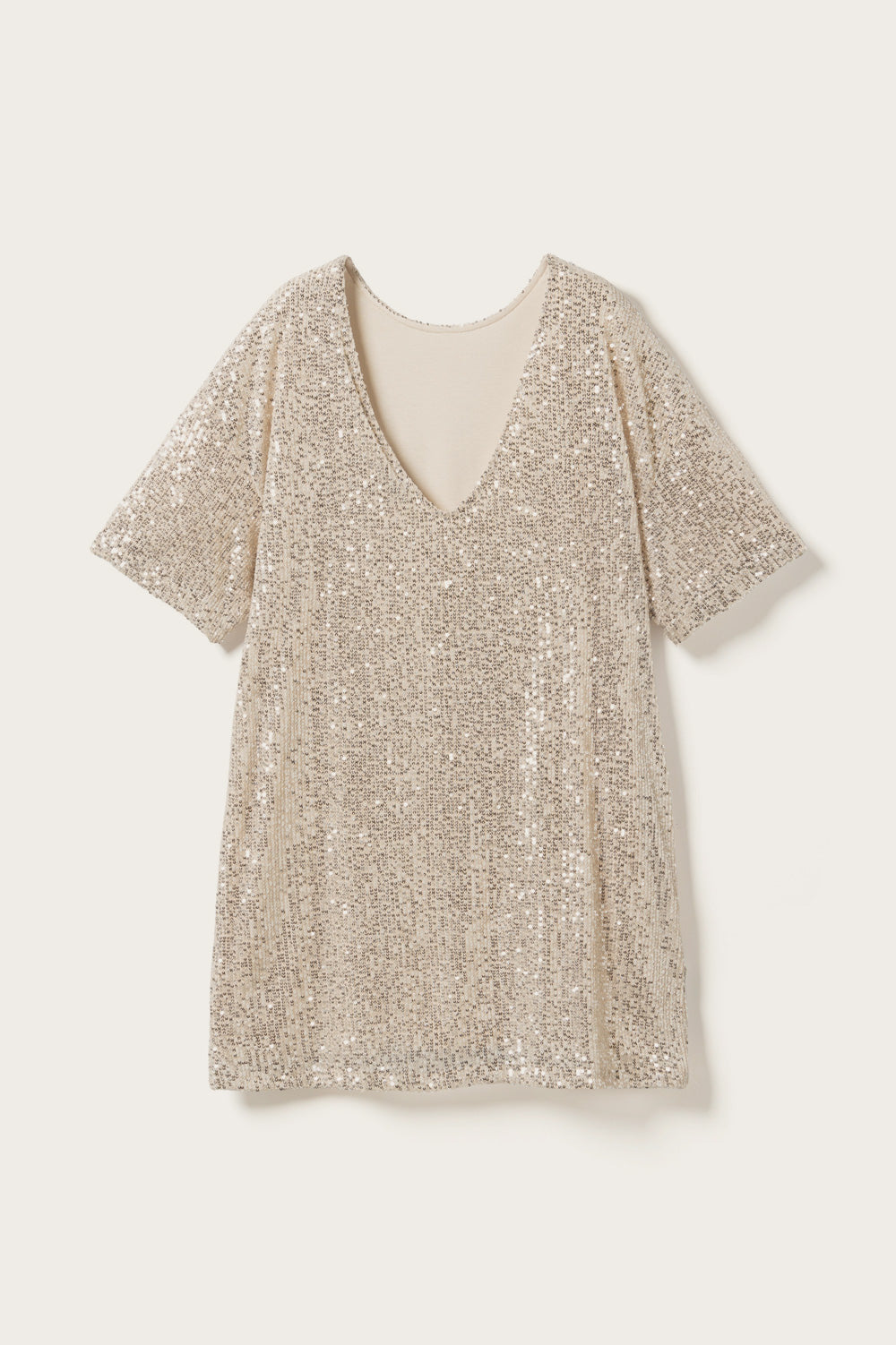 Lorah Dress er en kjole i T-skjorte-design med løs passform, korte ermer, paljetter og V-utringning på ryggen.