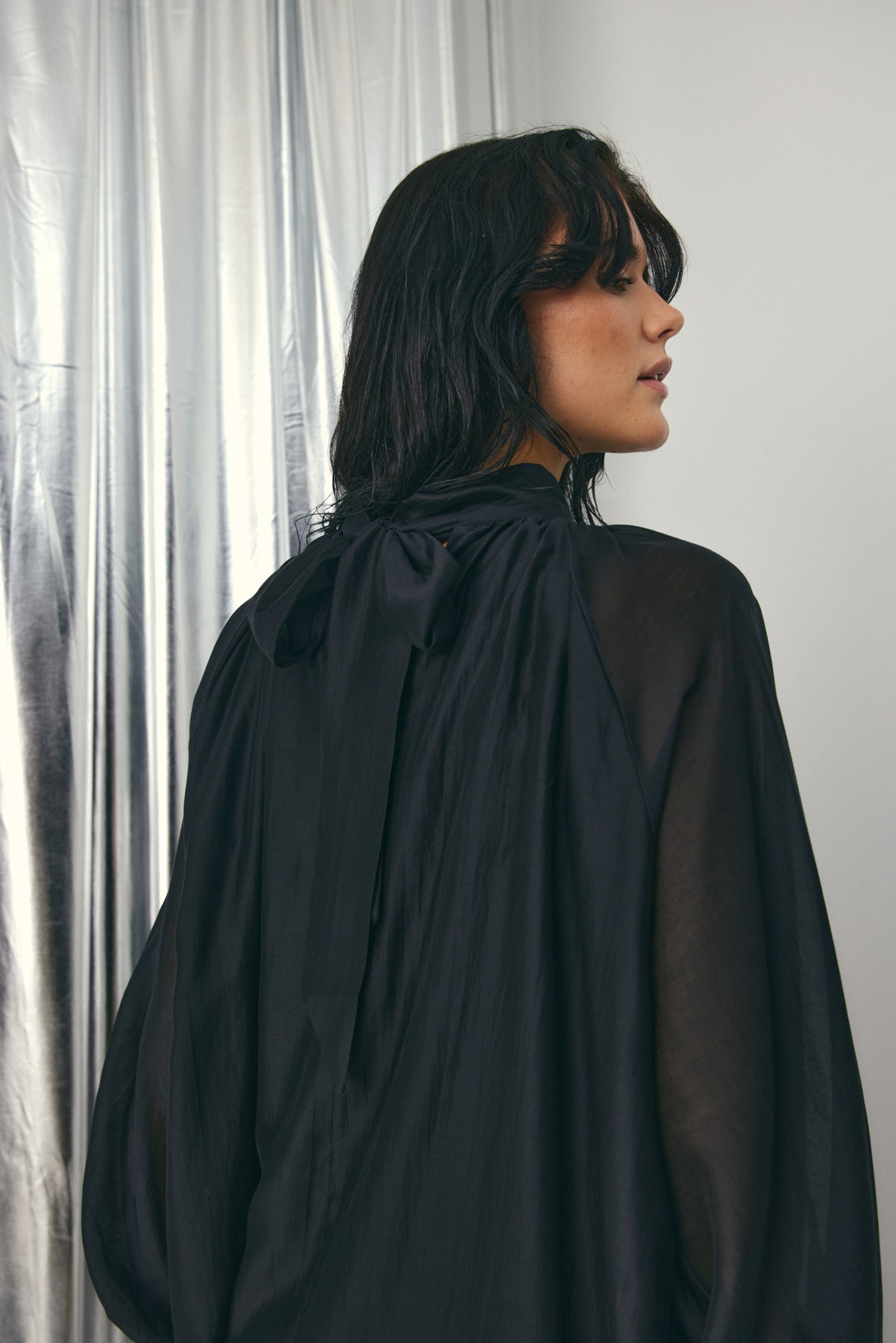 Lorenia Dress er en klassisk kort svart kjole med raglan-snitt. Kjolen har en løs passform med høy hals der lukkingen er en sløyfe.
