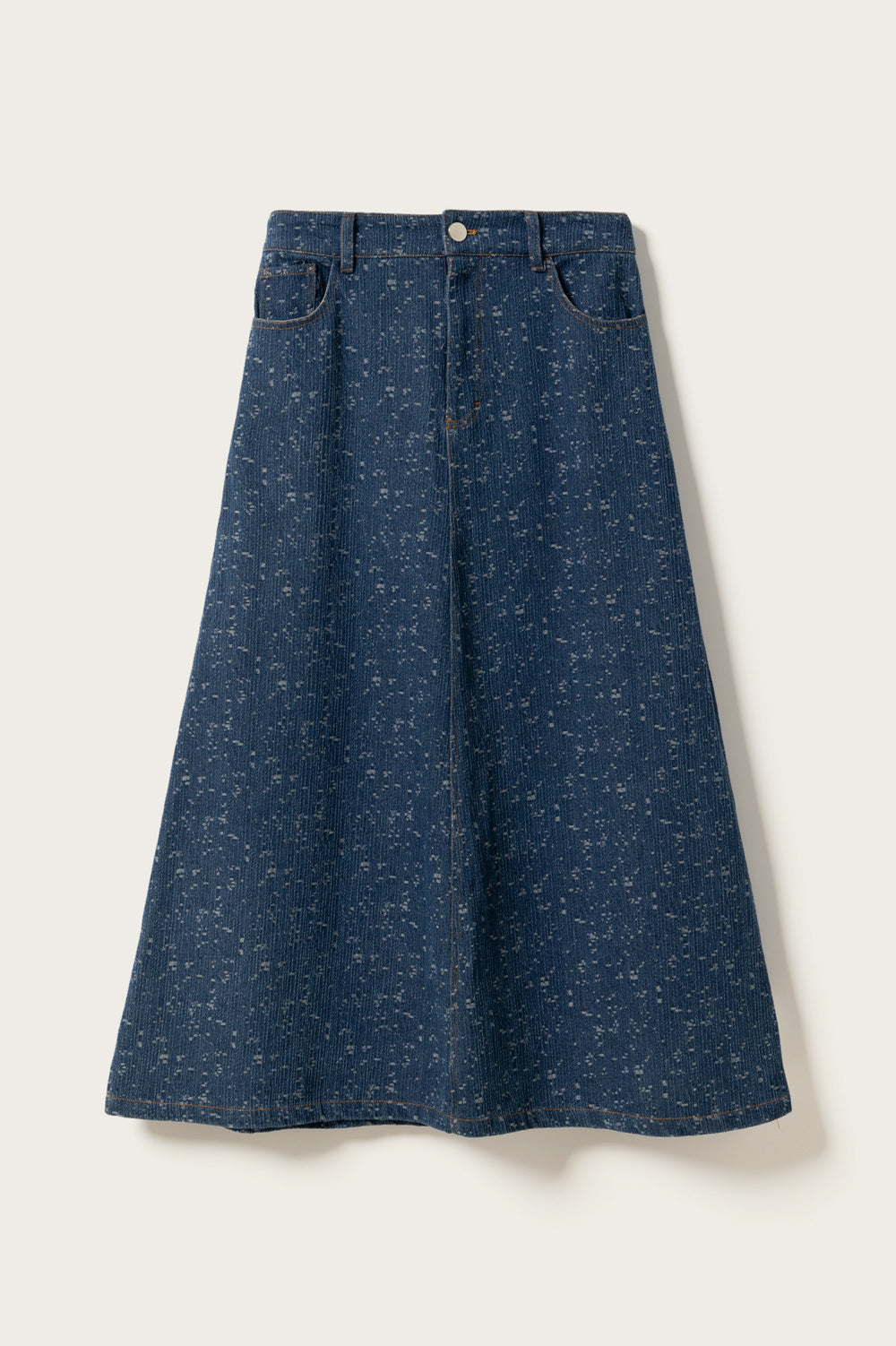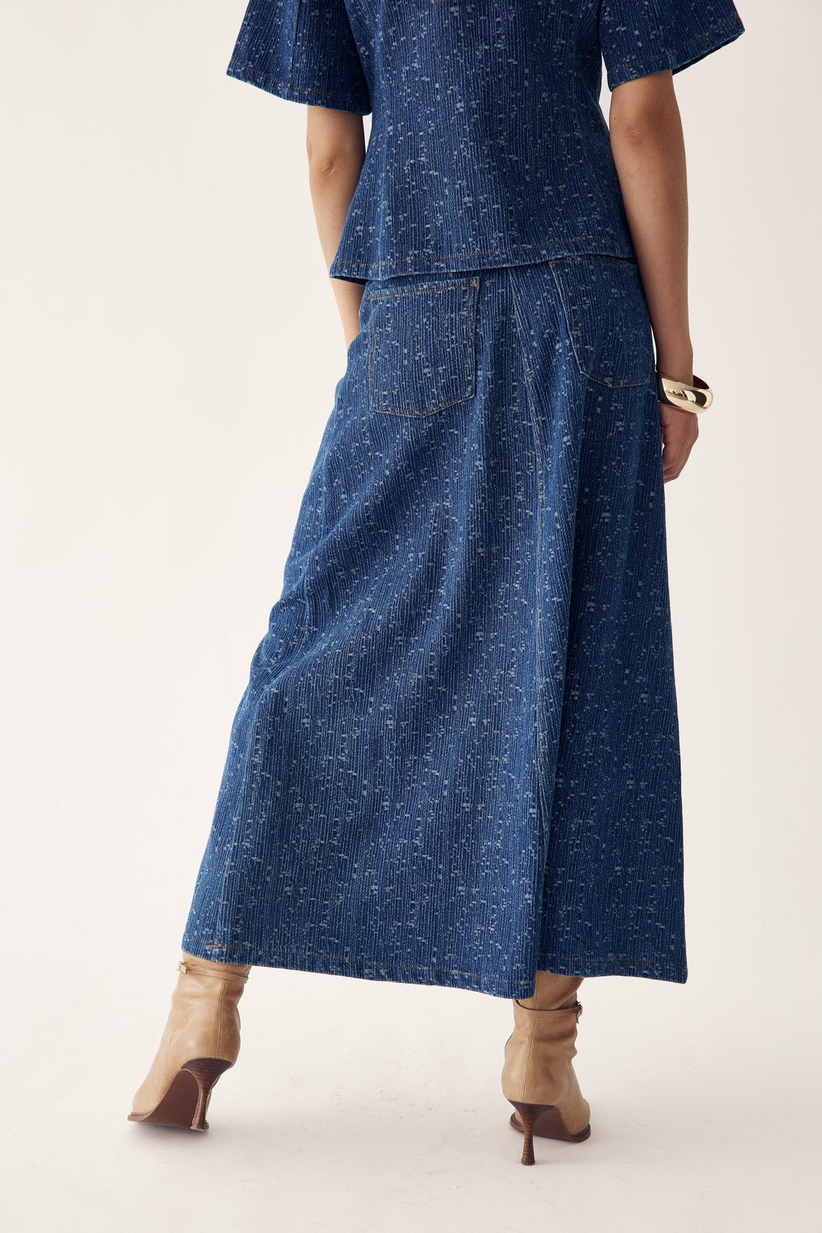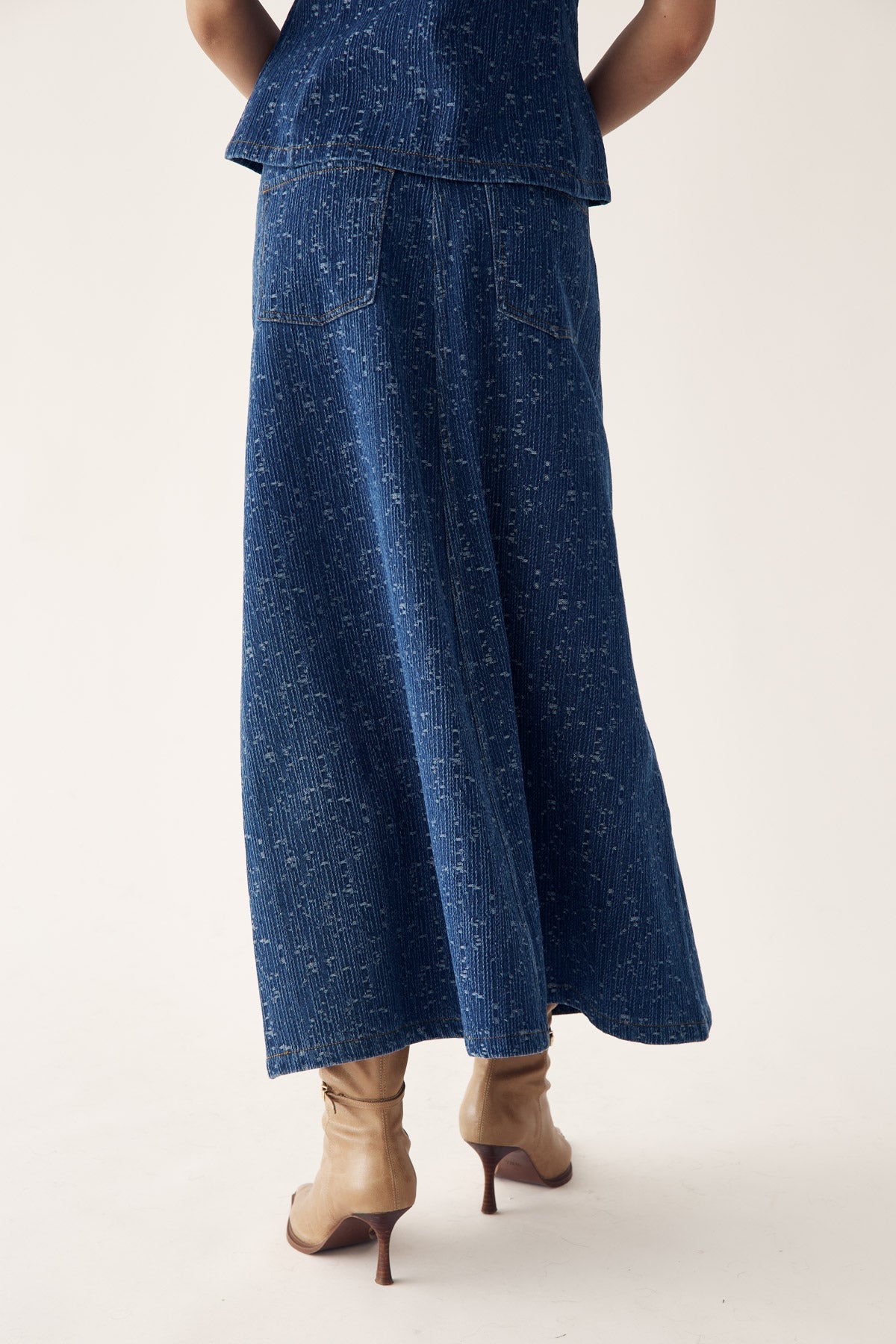Lyndall Skirt er en lang denimskjørt med lett A-form og klassisk design. Tidløst uttrykk som kan styles med både T-skjorte og skjorte.