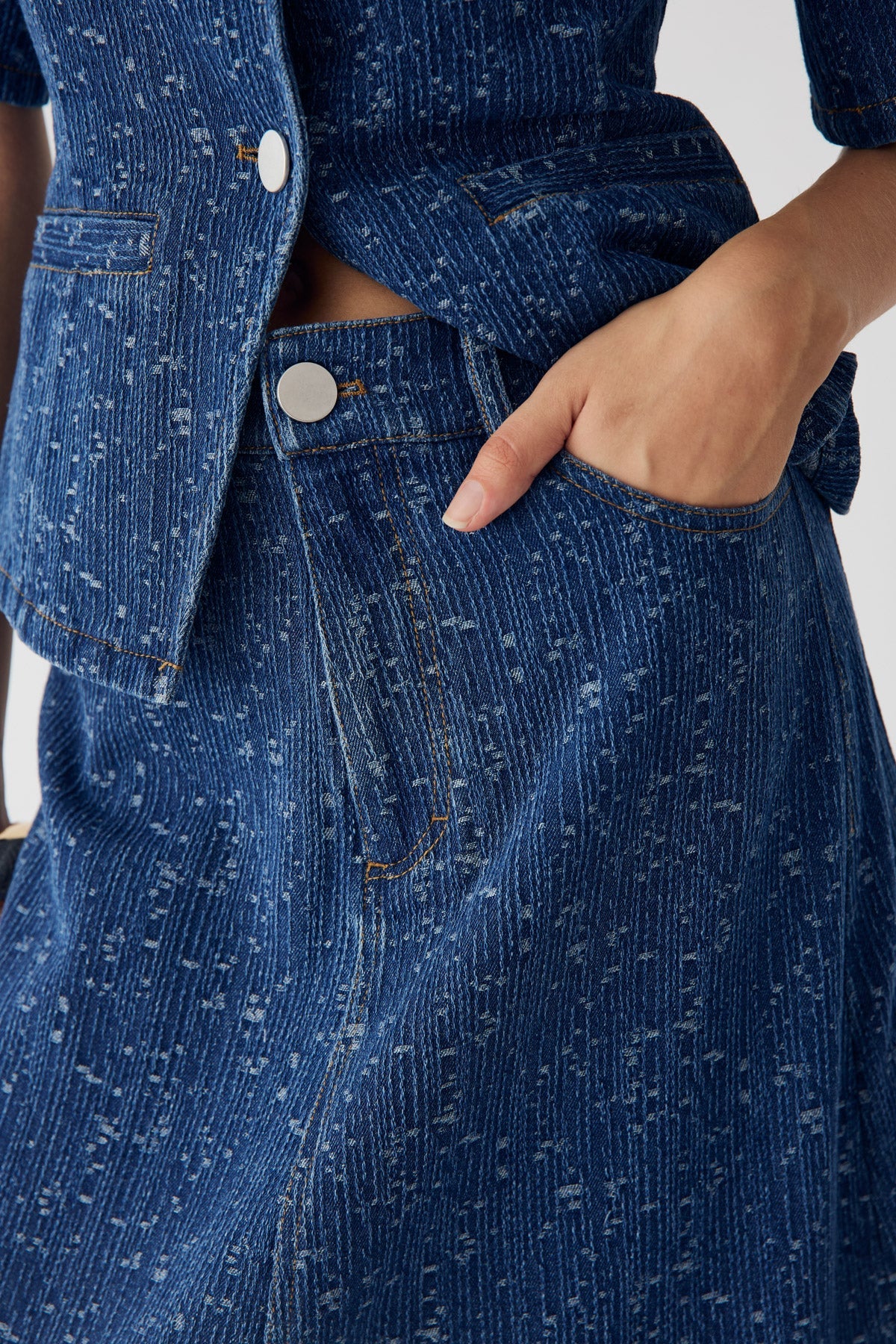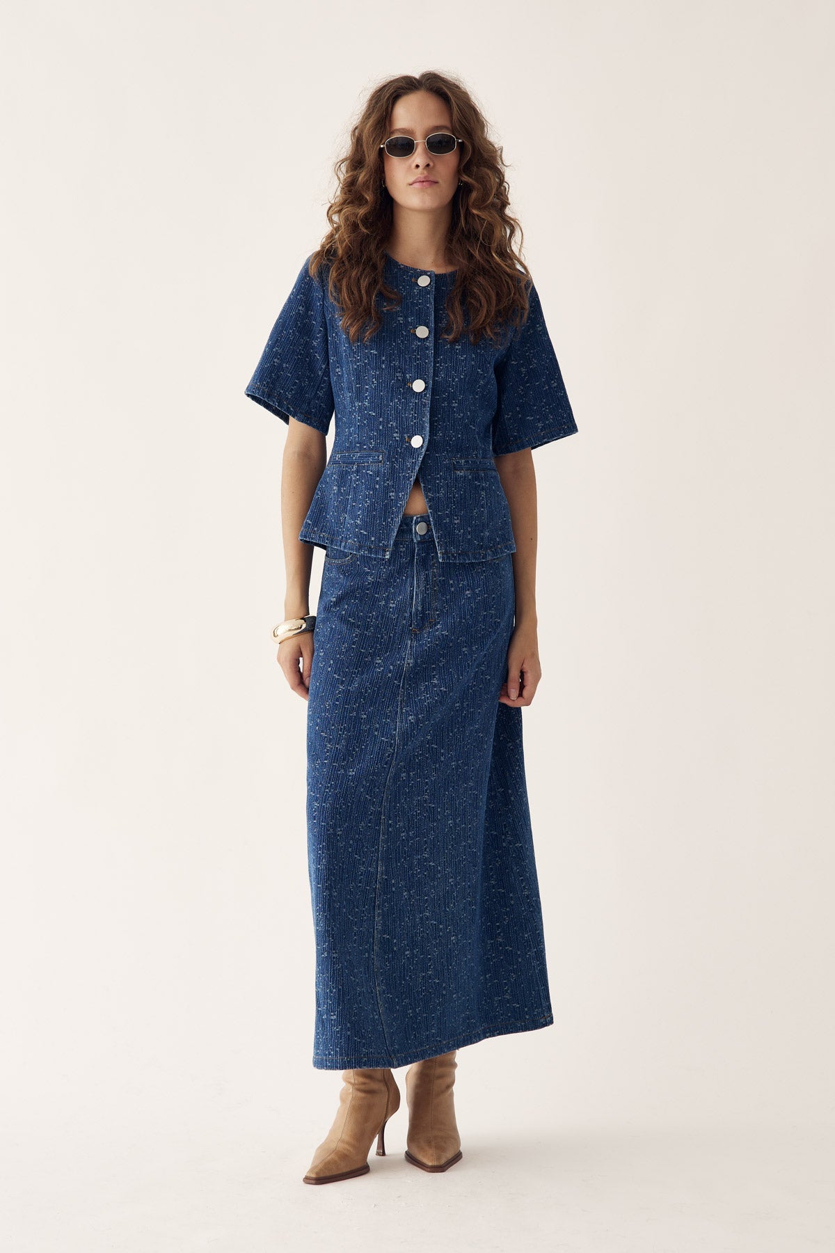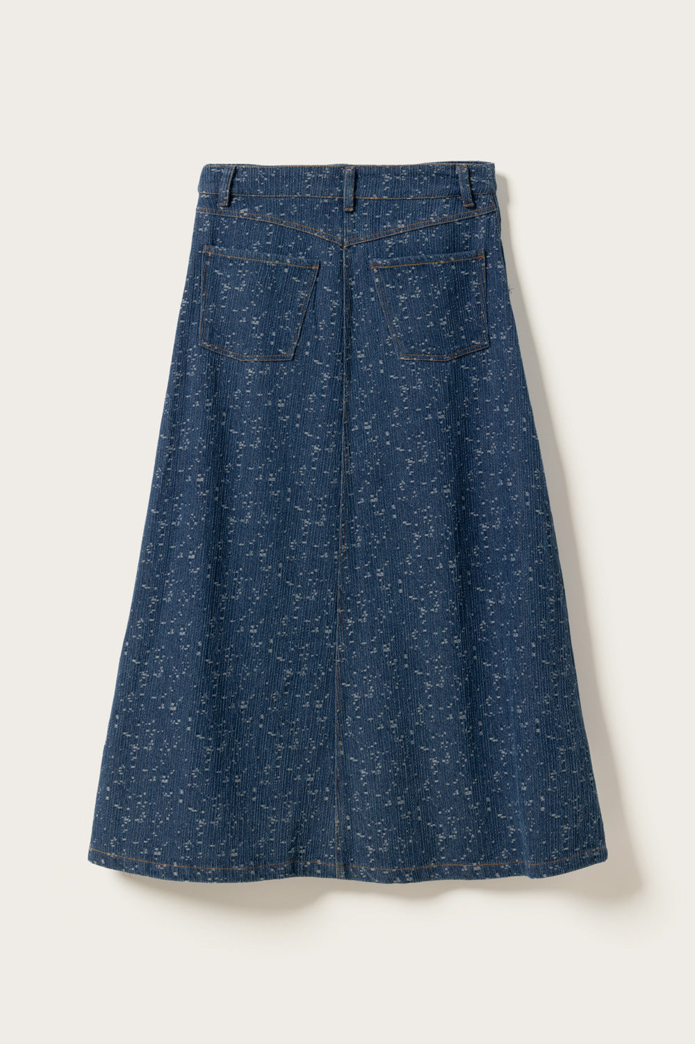 Lyndall Skirt er en lang denimskjørt med lett A-form og klassisk design. Tidløst uttrykk som kan styles med både T-skjorte og skjorte.