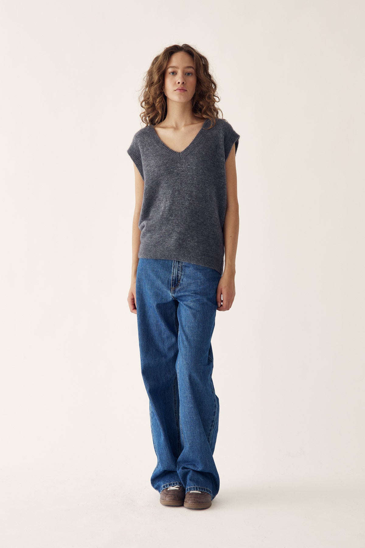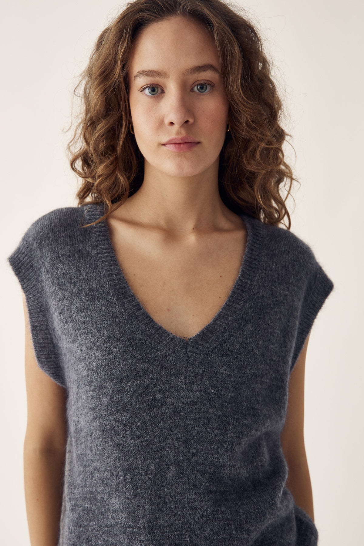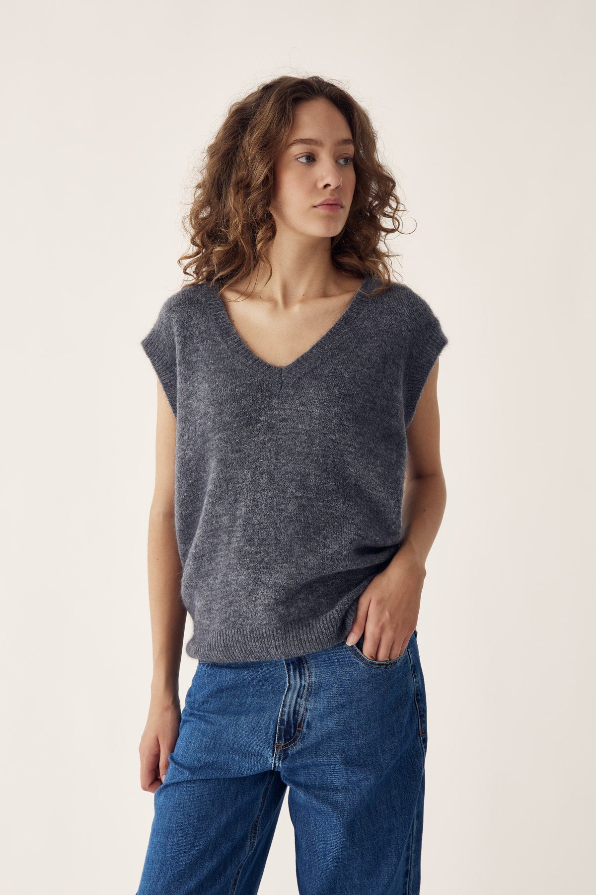 N-Leatrice Knit Vest er en strikkevest med V-hals, myk tekstur og løs passform. Vesten gir et avslappet og komfortabelt uttrykk, og kan styles over en blazer eller med skjorte under.