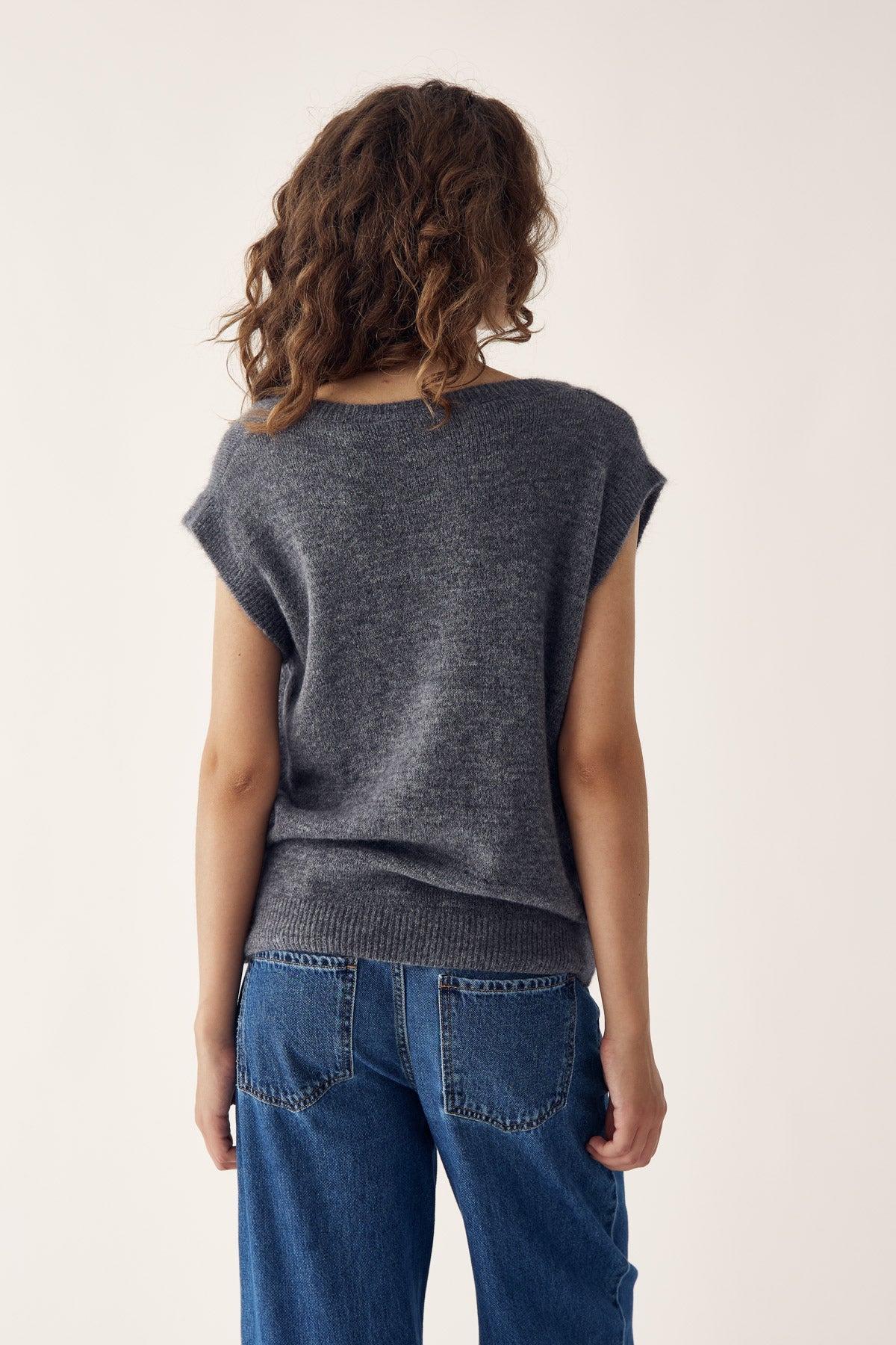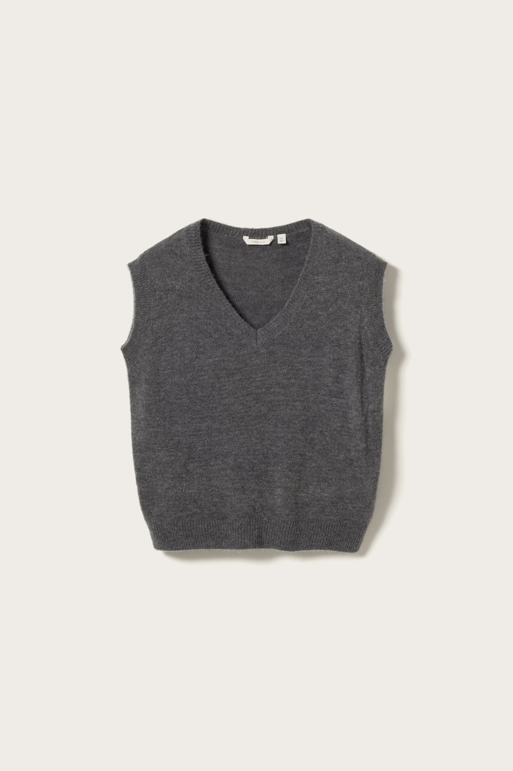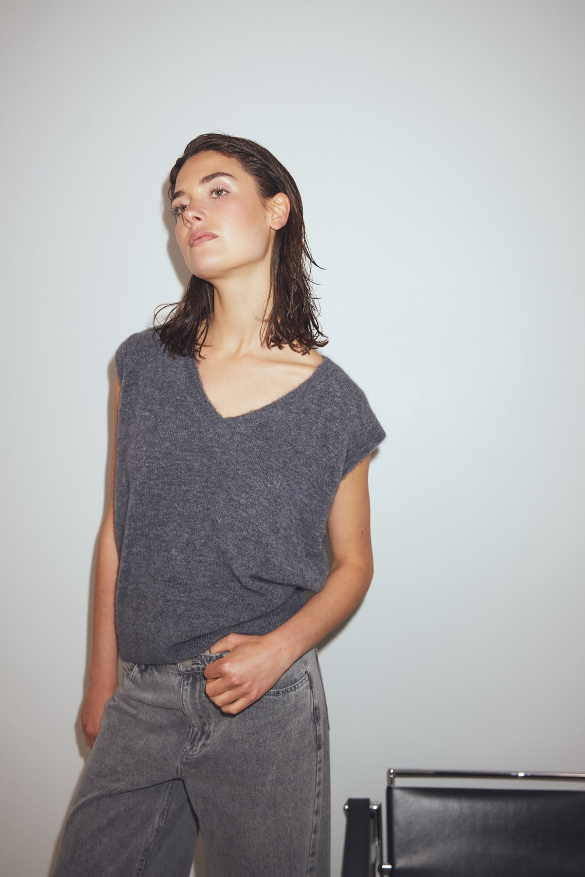 N-Leatrice Knit Vest er en strikkevest med V-hals, myk tekstur og løs passform. Vesten gir et avslappet og komfortabelt uttrykk, og kan styles over en blazer eller med skjorte under.