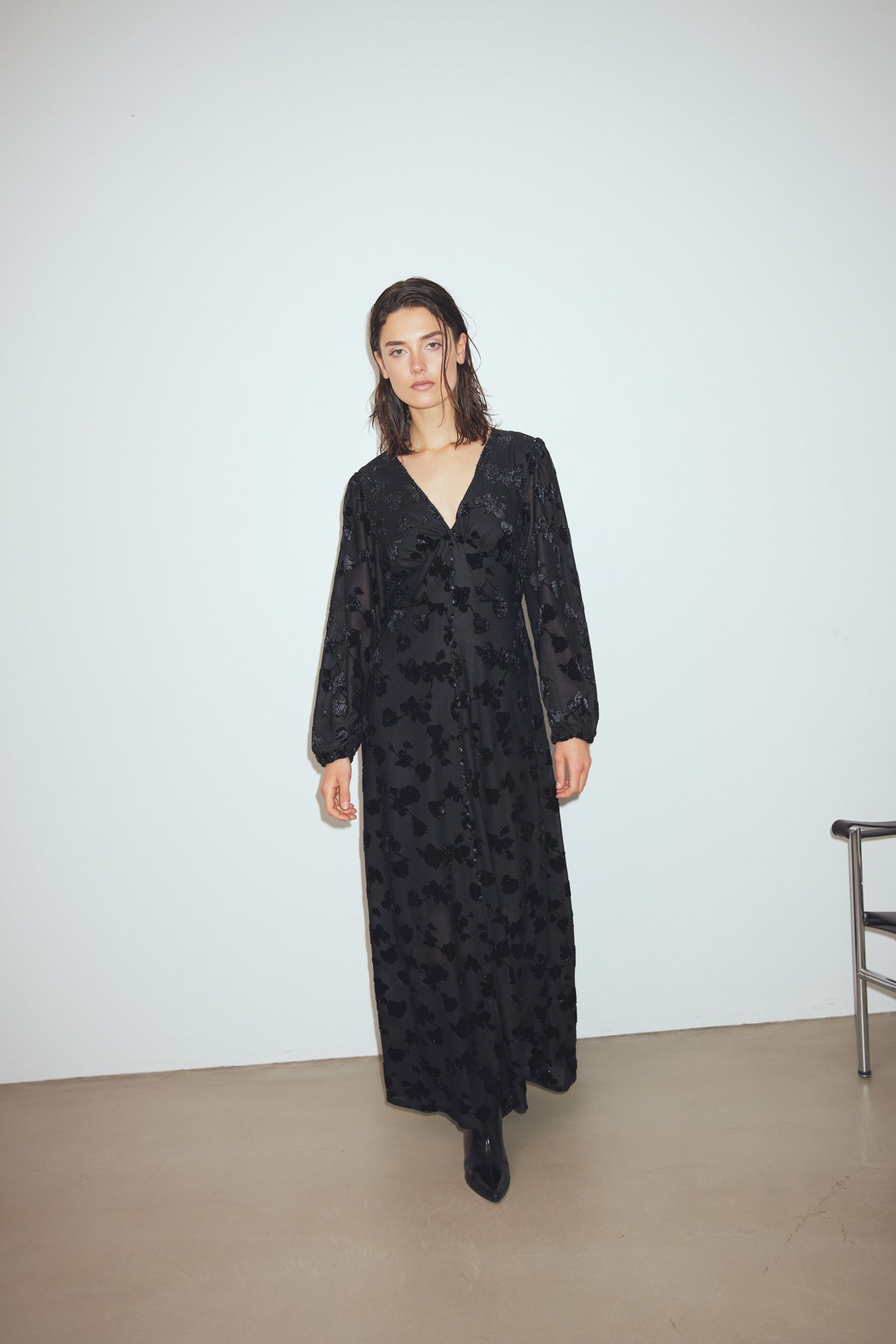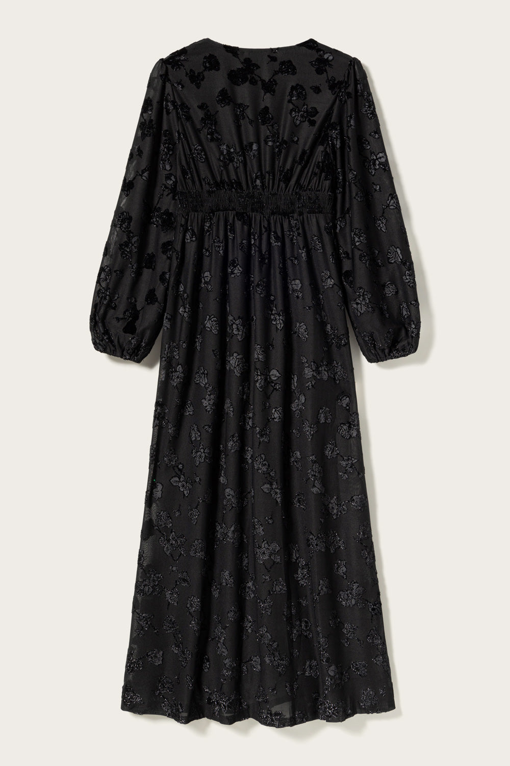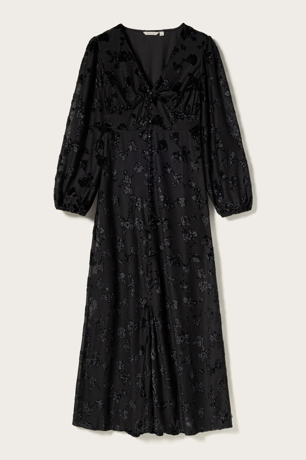 N-Lilith Maxi Dress er en maxikjole med lange ermer, splitt i siden, V-utringning og glitrende blomster i stoffet. N-Lilith Dress har en løs passform med en mer markert midje, som gir et luftig og feminint uttrykk og gjør den lett å style til enhver anledning.