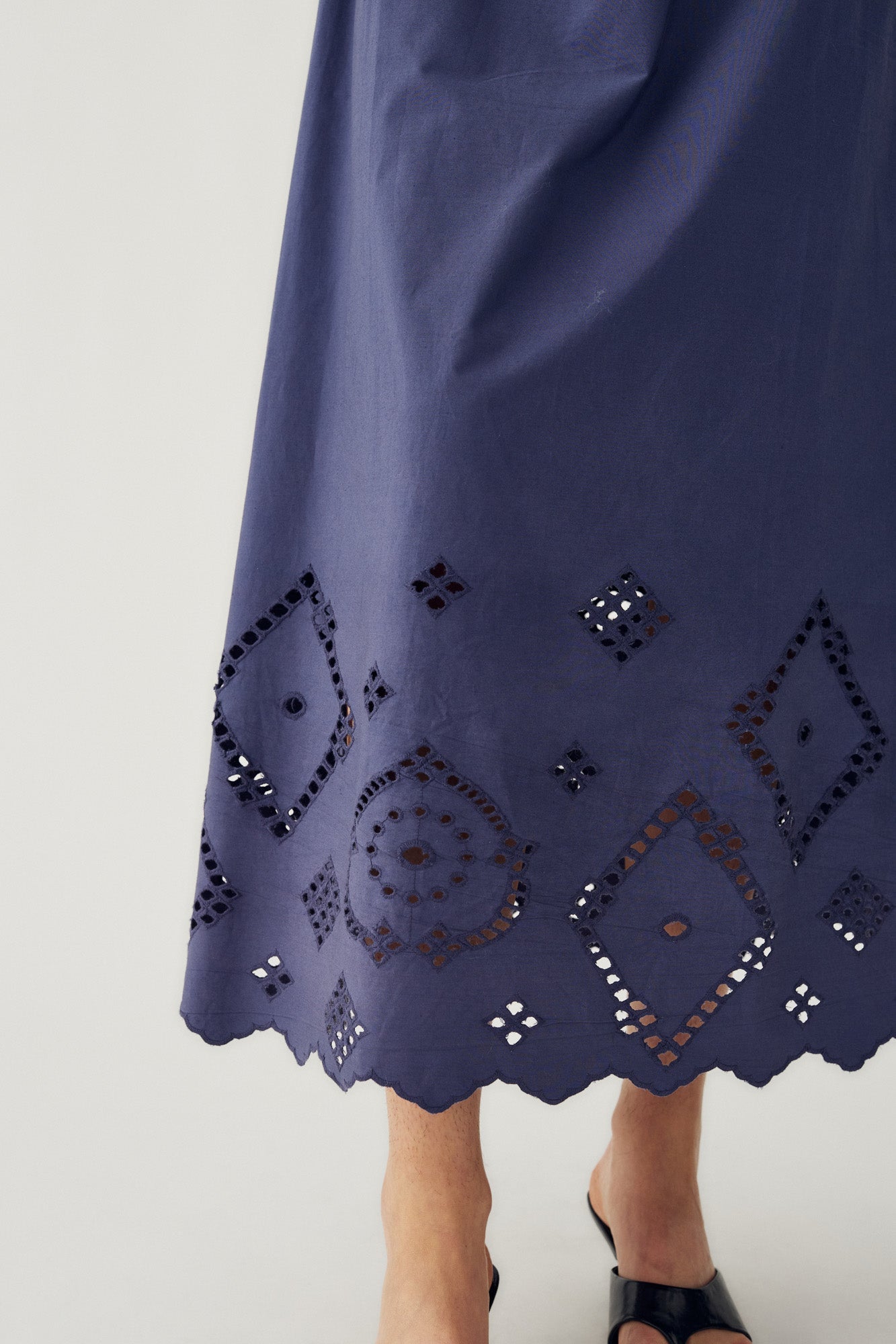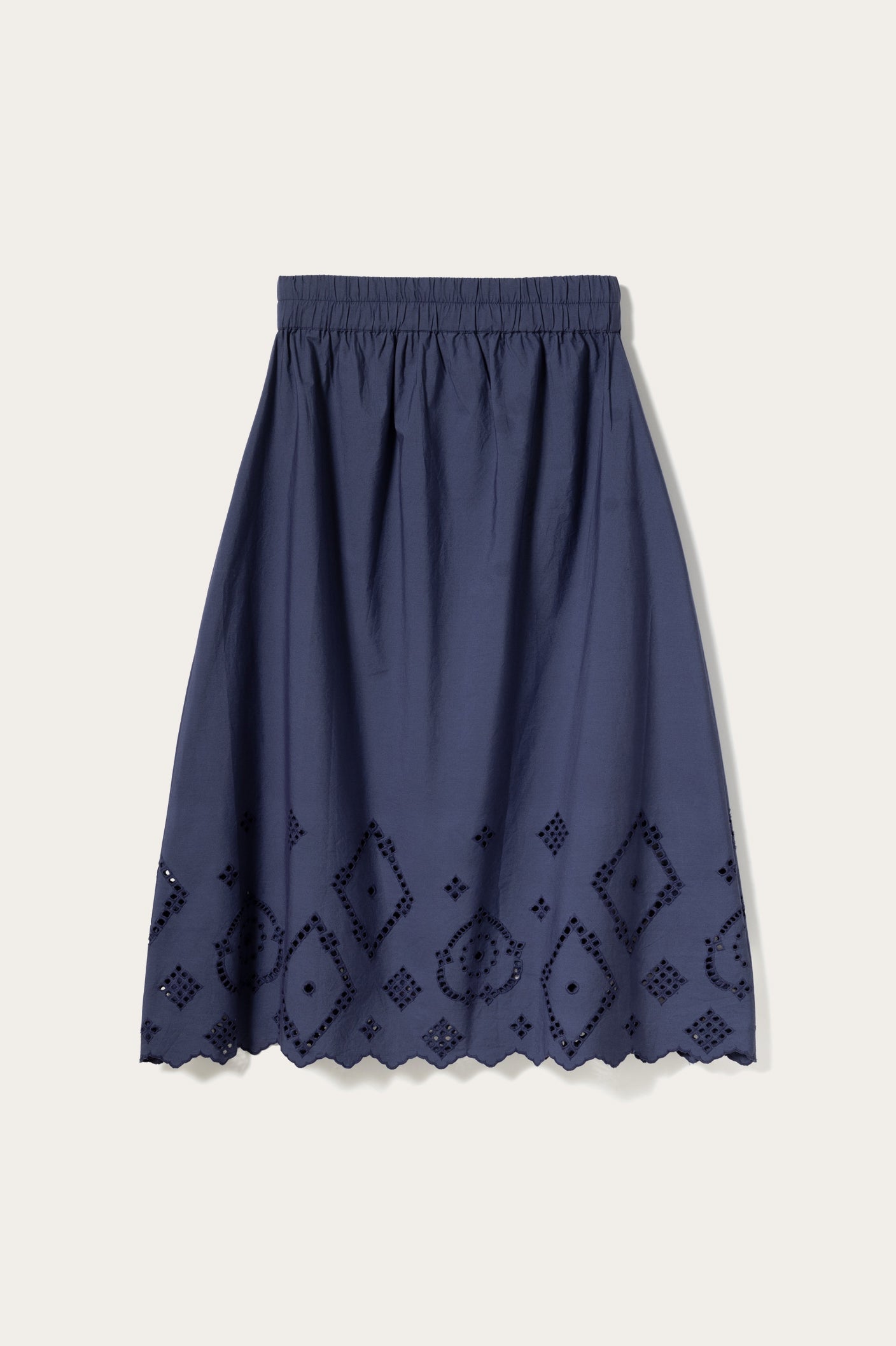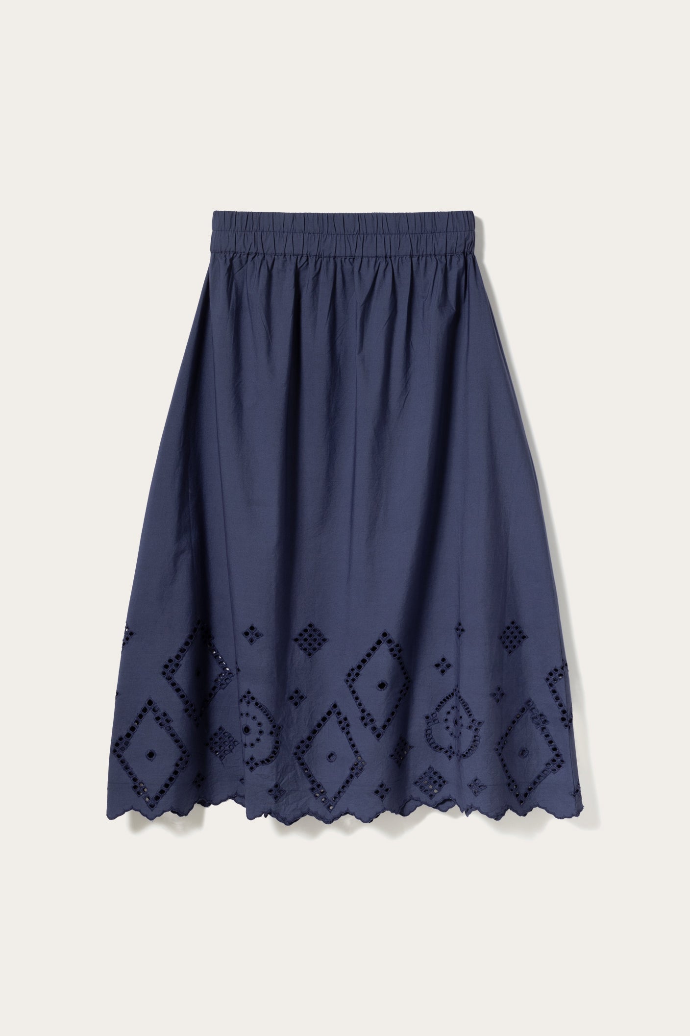 N-Marisol Skirt er et langt, luftig skjørt med komfortabel elastikk i livet og broderie anglaise langs nederkanten.