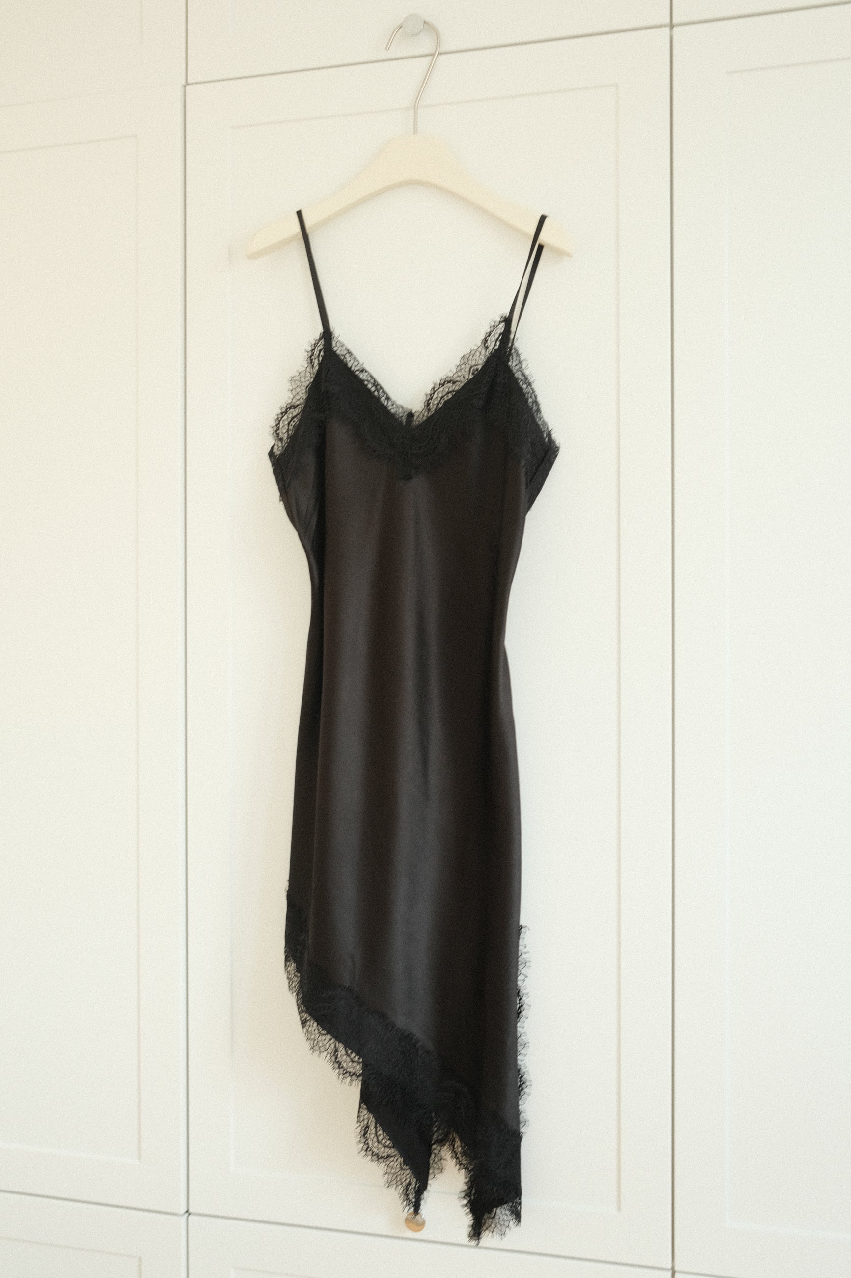 N-Merlie Dress er en satengkjole med fine blondedetaljer, asymmetrisk snitt, splitt i siden og justerbare stropper.