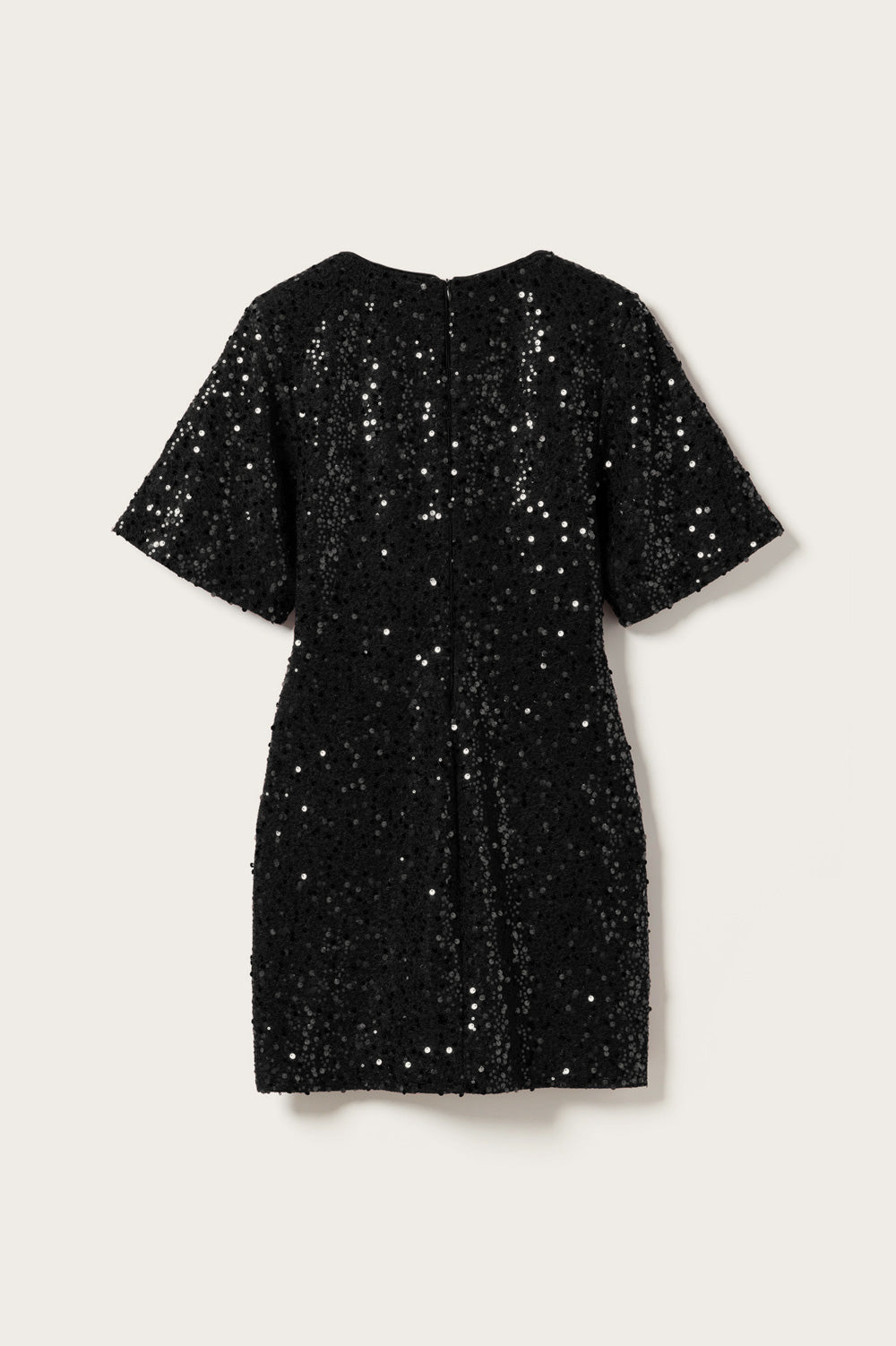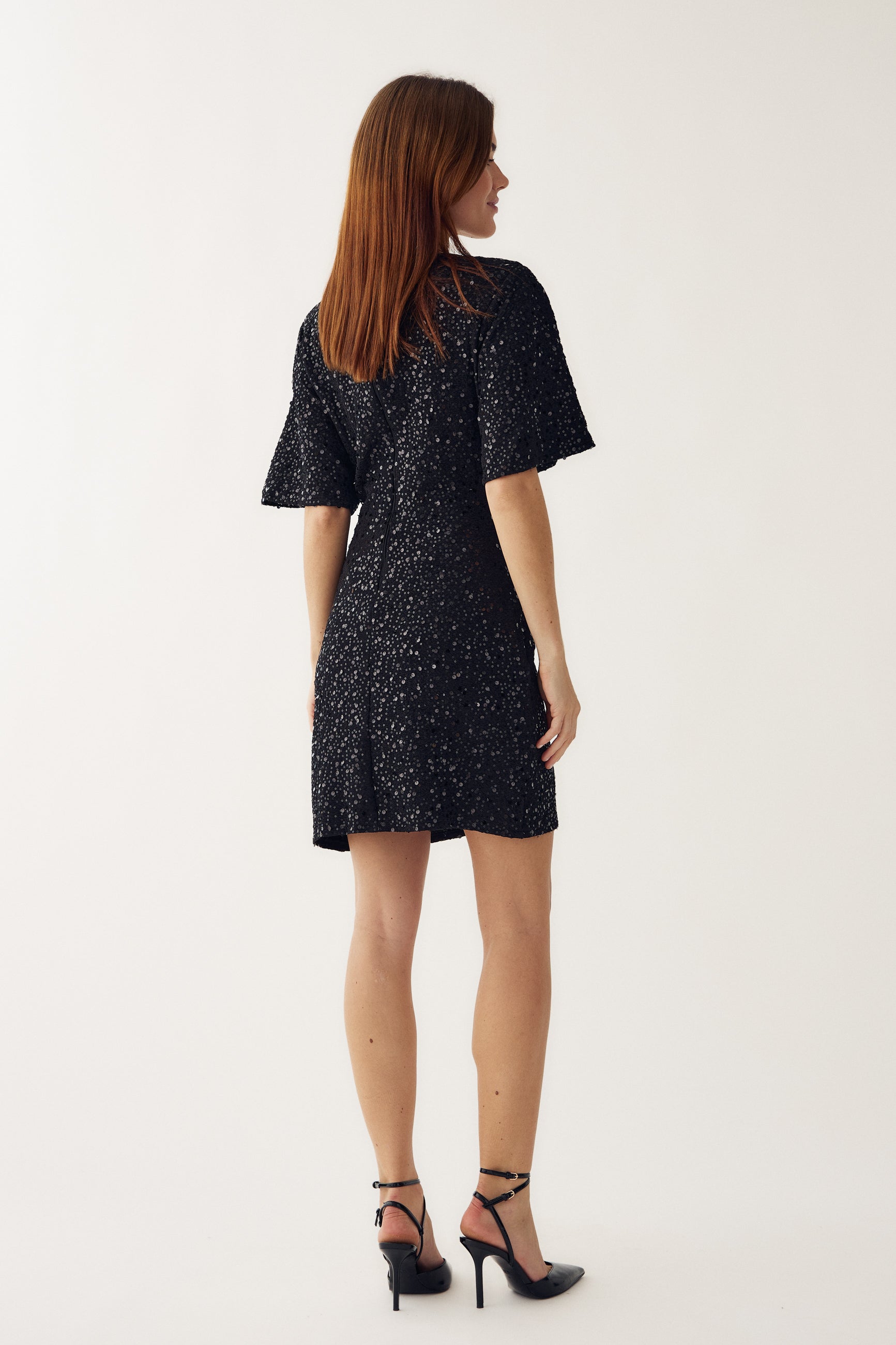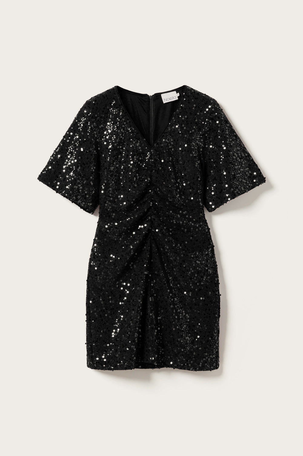 Soli Dress er en festkjole med korte ermer, V-hals, paljetter og smock-detalj foran. Kjolen har en tettsittende passform og er ideell som partywear.